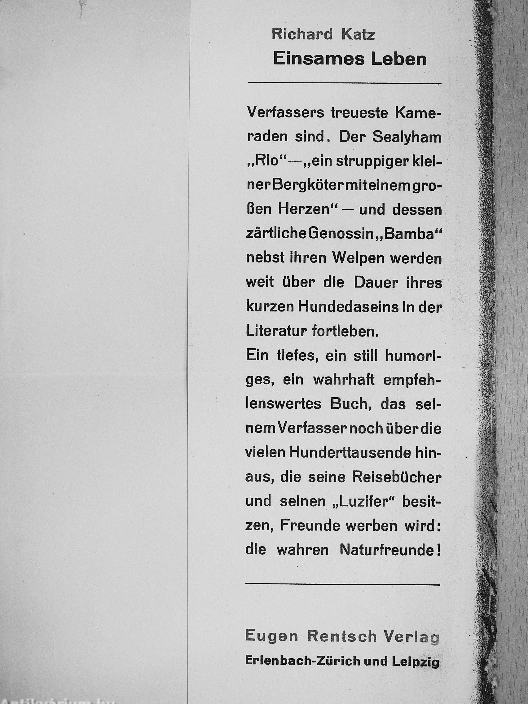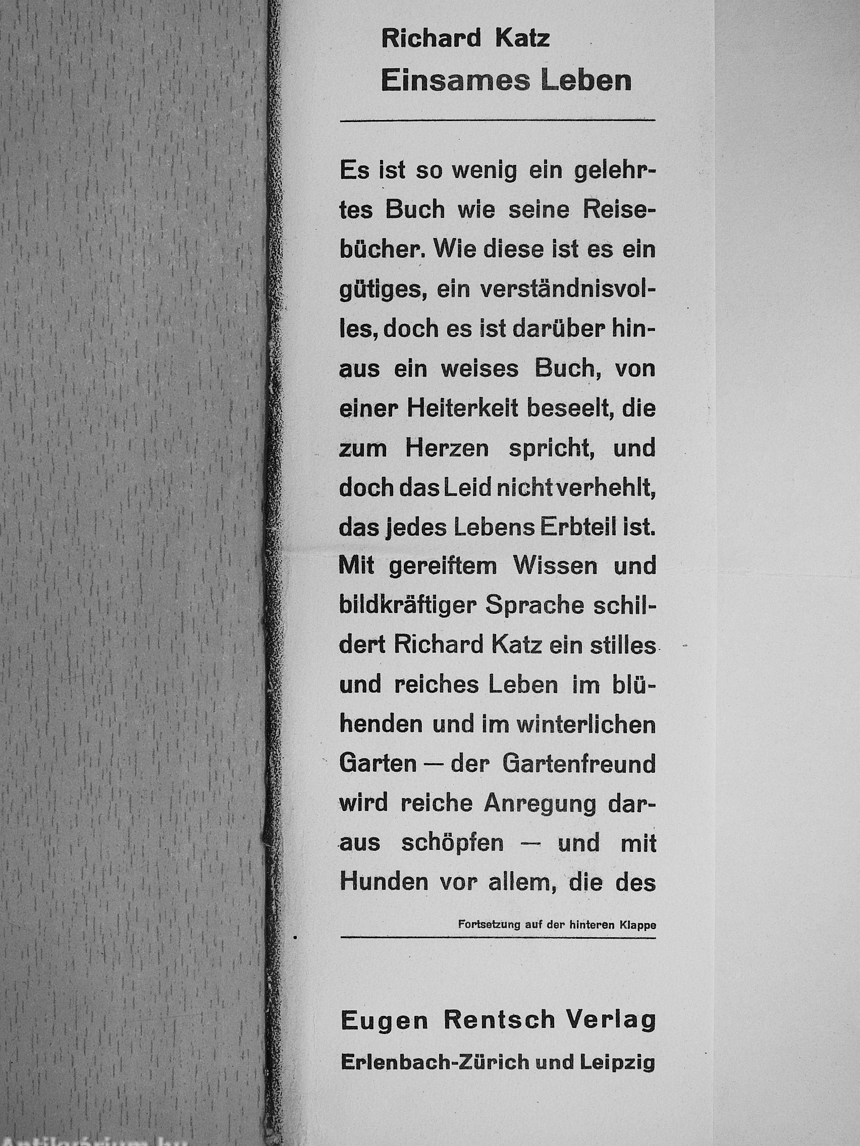 Es ist so wenig ein gelehrtes Buch wie seine Reisebücher. Wie diese ist es ein gütiges, ein verständnisvolles, doch es ist darüber hinaus ein weises Buch, von einer Heiterkeit beseelt, die zum Herzen spricht, und doch das Leid nicht verhehlt, das jedes Lebens Erbteil ist. Mit gereiftem Wissen und bildkräftiger Sprache schildert Richard Katz ein stilles und reiches Leben Im blühenden und im winterlichen Garten — der Gartenfreund wird reiche Anregung daraus schöpfen — und mit Hunden vor allem, die des