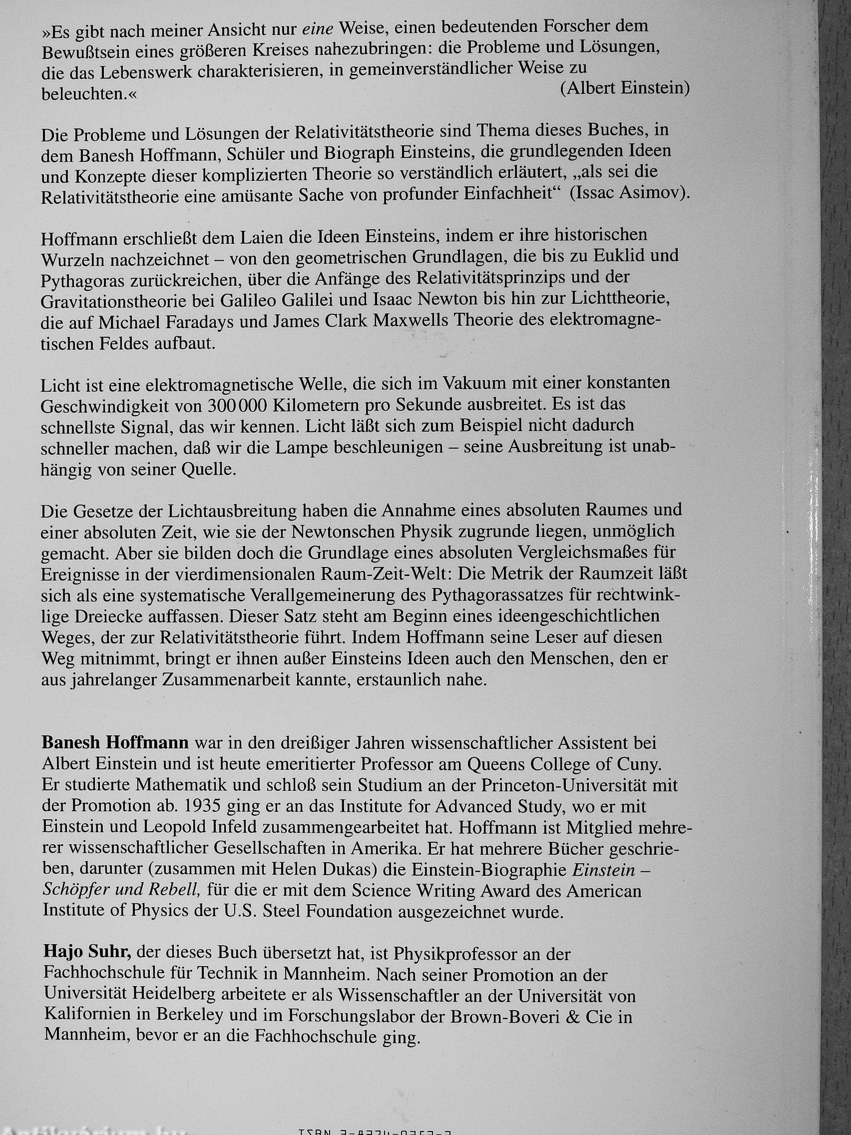 Banesh Hoffmann war in den dreißiger Jahren wissenschaftlicher Assistent bei Albert Einstein und ist heute emeritierter Professor am Queens College of Cuny. Er studierte Mathematik und schloß sein Studium an der Princeton-Universität mit der Promotion ab. 1935 ging er an das Institute for Advanced Study, wo er mit Einstein und Leopold Infeld zusammengearbeitet hat. Hoffmann ist Mitglied mehrerer wissenschaftlicher Gesellschaften in Amerika. Er hat mehrere Bücher geschrieben, darunter (zusammen mit Helen Dukas) die Einstein-Biographie Einstein -Schöpfer und Rebell, für die er mit dem Science Writing Award des American Institute of Physics der U.S. Steel Foundation ausgezeichnet wurde.