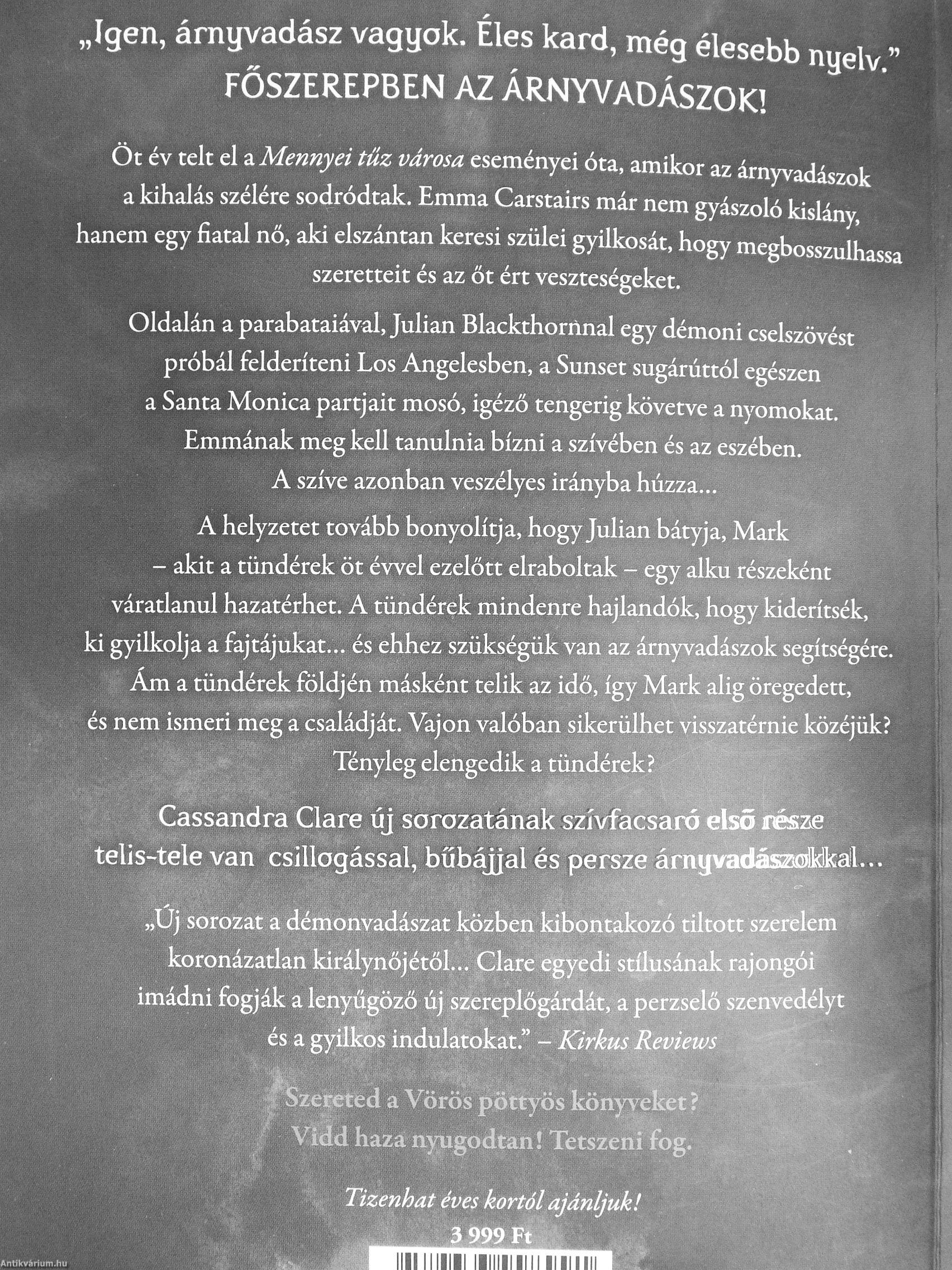 Oldalán a parabataiával, Julián Blackthornnal egy démoni cselszövést próbál felderíteni Los Angelesben, a Sunset sugárúttól egészen a Santa Monica partjait mosó, igéző tengerig követve a nyomokat. Emmának meg kell tanulnia bízni a szívében és az eszében. A szíve azonban veszélyes irányba húzza A helyzetet tovább bonyolítja, hogy Julián bátyja, Mark - akit a tündérek öt évvel ezelőtt elraboltak - egy alku részeként váradanul hazatérhet. A tündérek mindenre hajlandók, hogy kiderítsék, ki gyilkolja a fajtájukat és ehhez szükségük van az árnyvadászok segítségére.