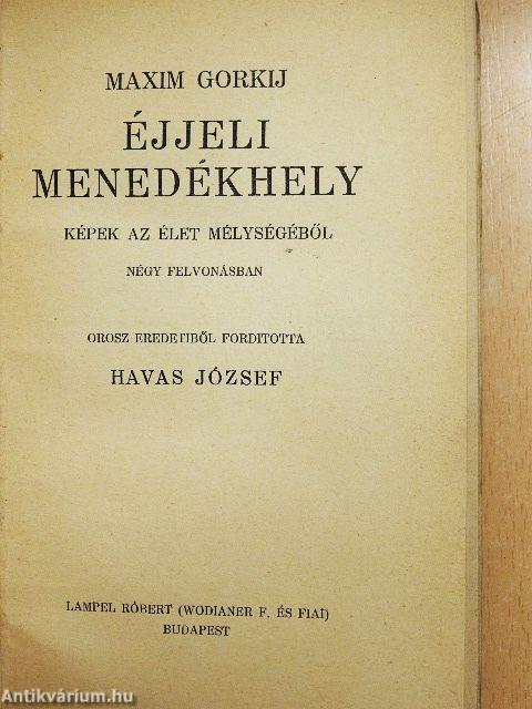 Barlanghoz hasonló pince. A mennyezet súlyos kőboltozat a füst belepte, vakolata lehulladozott. Világosság - a néző felől felülről lefelé - egy négyszögletes ablakon át a jobb oldalon hatol a színre. A szín jobb sarkát Pepel vékony fallal elválasztott szobája foglalja el, ebben a szobában az ajtó közelében - Bubnov deszka-ágya (priccse). A bal sarokban nagy orosz kályha; balra, a kőfalon ajtó a konyhára, a hol Kvásnya, a báró és Násztya laknak. A kályha és a falba vágott ajtó között széles ágy, amely előtt széles karton-függöny lóg. A falak mellett körös-körül priccsek. Elől a fal mellett nagy fatuskó, amelyre satu és kis üllő van erősítve, mellette egy másik, kisebb. E kisebbiken ül Klescs az üllő előtt, és ócska závárokhoz kulcsokat próbálgat. Lába előtt két nagy csomó, mindenféle kulcs, amelyek drótkarikára vannak felhúzva, egy horpadt oldalú pléhszamovár, kis kalapács, reszelők. A szin közepén nagy asztal, két pad, zsámoly, mind festetlen, szennyes. Kvásnya az asztal mellett szamovár körül gazdasszonykodik, a báró fekete kenyéren rágódik, Násztya össze-vissza gyűrődött könyvet olvas a széken, rákönyökölve az asztalra. Az ágyon, a függönytől eltakarva, Anna fekszik és sűrűn köhög. Bubnov, deszkaágyán ülve, egy mintababán, melyet térde közé szorít, ócska, szétfejtett nadrágokból sapkáknak valót méricskél.