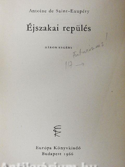 Kötetünkben három "repülőregényét" közöljük, az 1929-es születésű Déli fúrógép-et, amelyet a Szaharában írt, az 1931-es Éjszakai repülés-t, amely az atlanti-óceáni postarepülő-vonalak felderítésének idején készült, az 1939-es Az ember földjé-t.