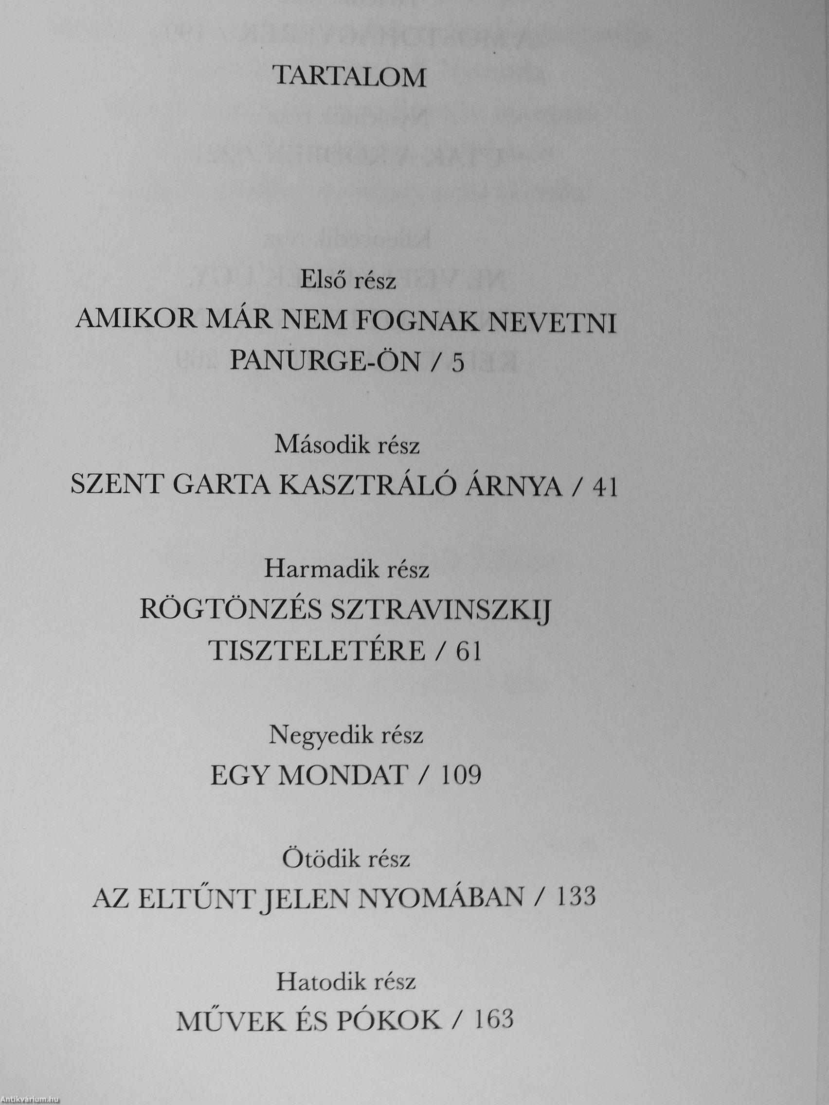 A kötet legfőbb, valódi hőse azonban maga a regény művészete: a gar-gantuai szellem, a humor, amelyből született, rejtélyes rokonsága a zenével, három idősíkon zajló története, a harmadik s eddig utolsó kor (a modern regény) esztétikája, egzisztencialista bölcsessége.