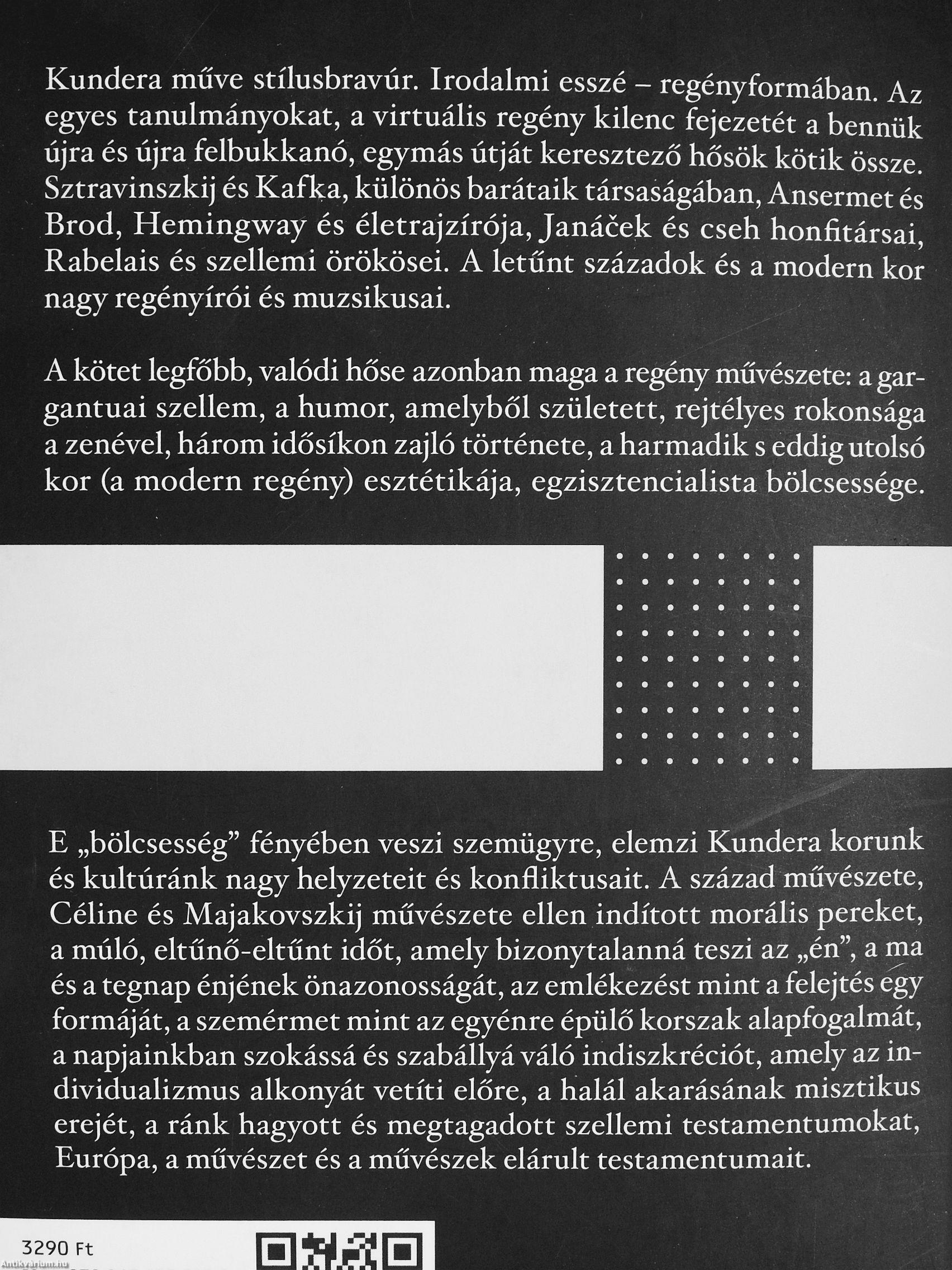 E „bölcsesség" fényében veszi szemügyre, elemzi Kundéra korunk és kultúránk nagy helyzeteit és konfliktusait. A század művészete, Céline és Majakovszkij művészete ellen indított morális pereket, a múló, eltűnő-eltűnt időt, amely bizonytalanná teszi az „én", a ma és a tegnap énjének önazonosságát, az emlékezést mint a felejtés egy formáját, a szemérmet mint az egyénre épülő korszak alapfogalmát, a napjainkban szokássá és szabállyá váló indiszkréciót, amely az individualizmus alkonyát vetíti előre, a halál akarásának misztikus erejét, a ránk hagyott és megtagadott szellemi testamentumokat, Európa, a művészet és a művészek elárult testamentumait.