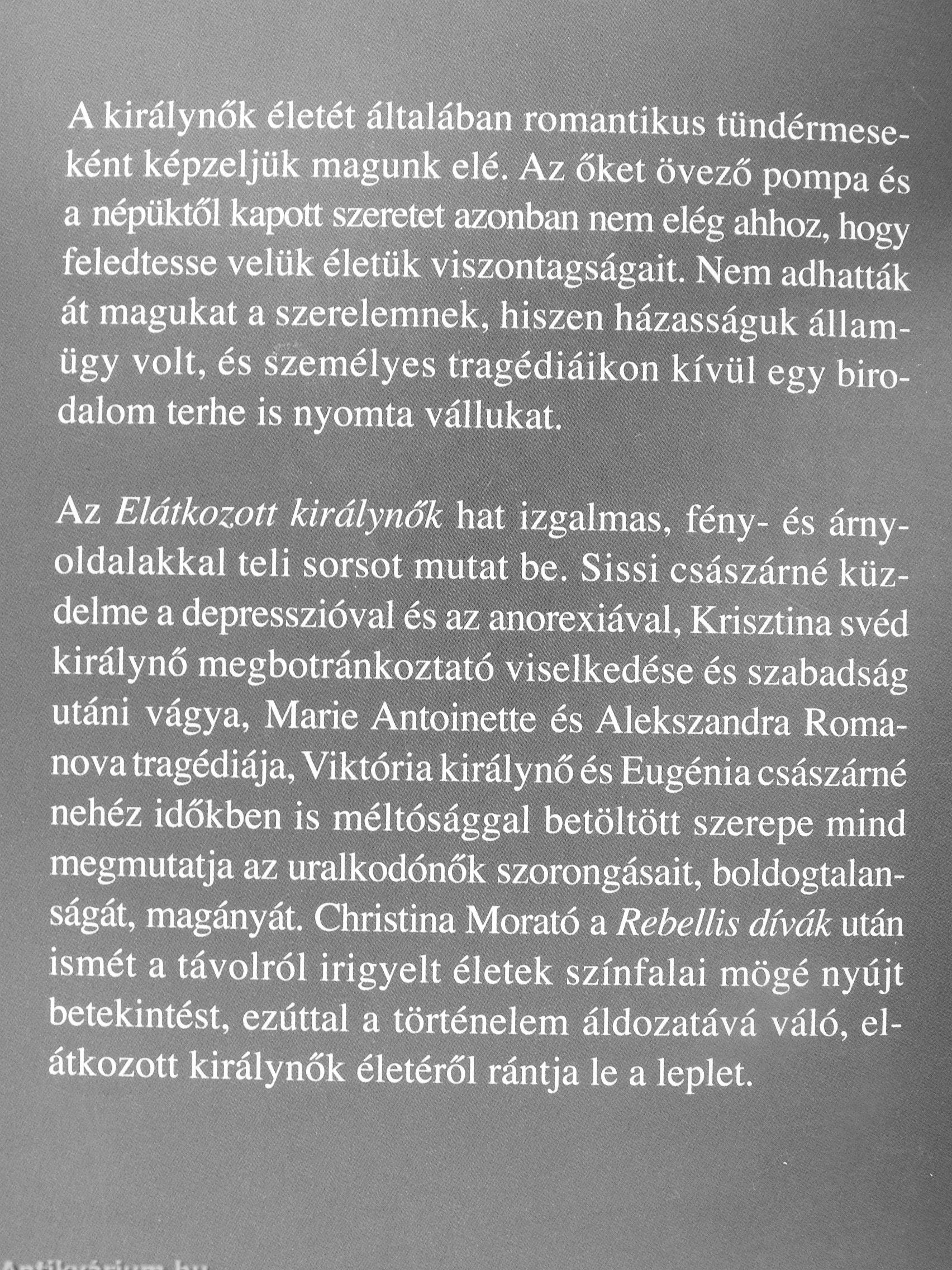 Az Elátkozott királynők hat izgalmas, fény- és árnyoldalakkal teli sorsot mutat be. Sissi császárné küzdelme a depresszióval és az anorexiával, Krisztina svéd királynő megbotránkoztató viselkedése és szabadság utáni vágya, Marié Antoinette és Alekszandra Roma-nova tragédiája, Viktória királynő és Eugénia császárné nehéz időkben is méltósággal betöltött szerepe mind megmutatja az uralkodónők szorongásait, boldogtalanságát, magányát. Christina Morató a Rebellis dívák után ismét a távolról irigyelt életek színfalai mögé nyújt betekintést, ezúttal a történelem áldozatává váló, elátkozott királynők életéről rántja le a leplet.