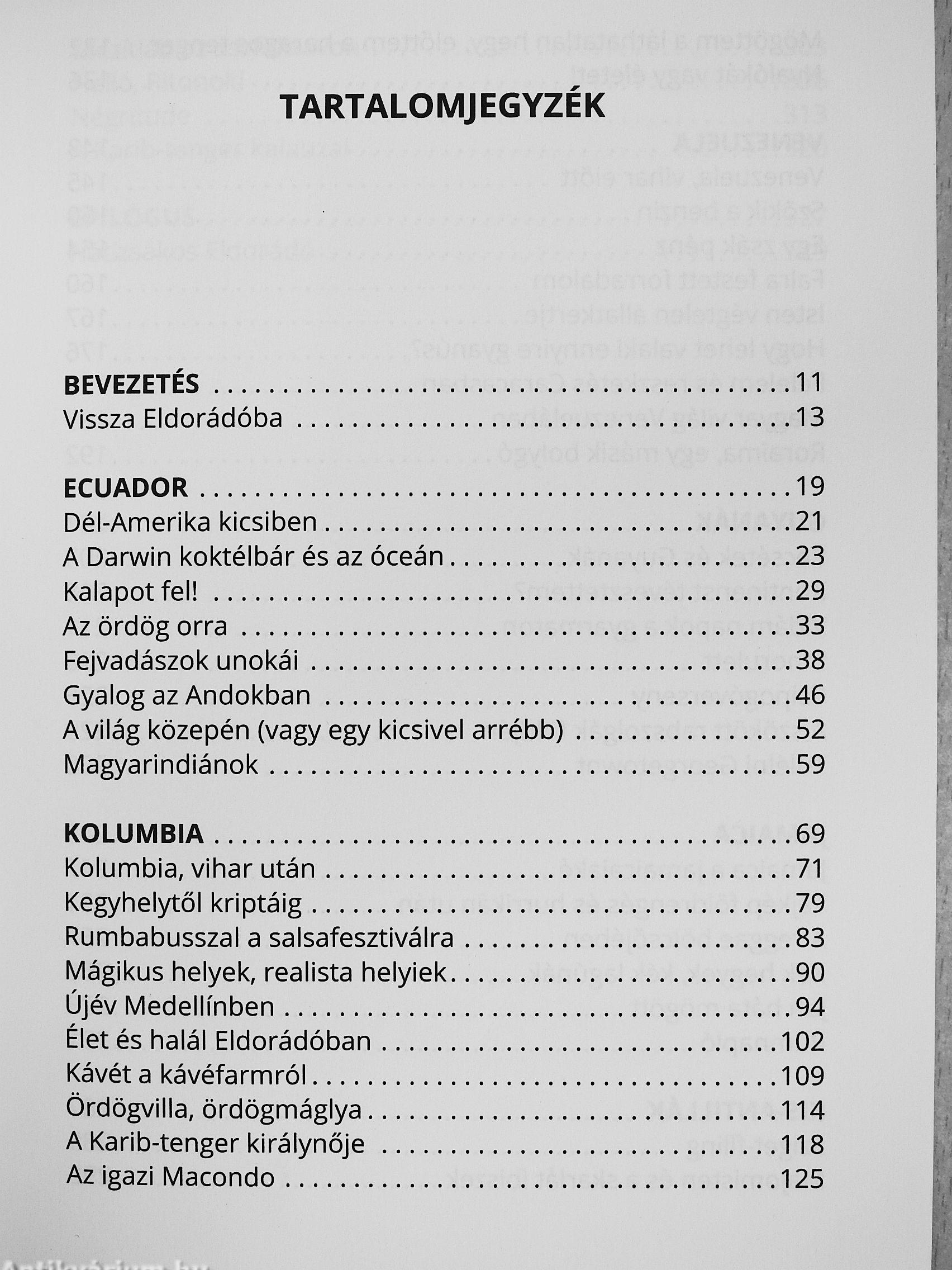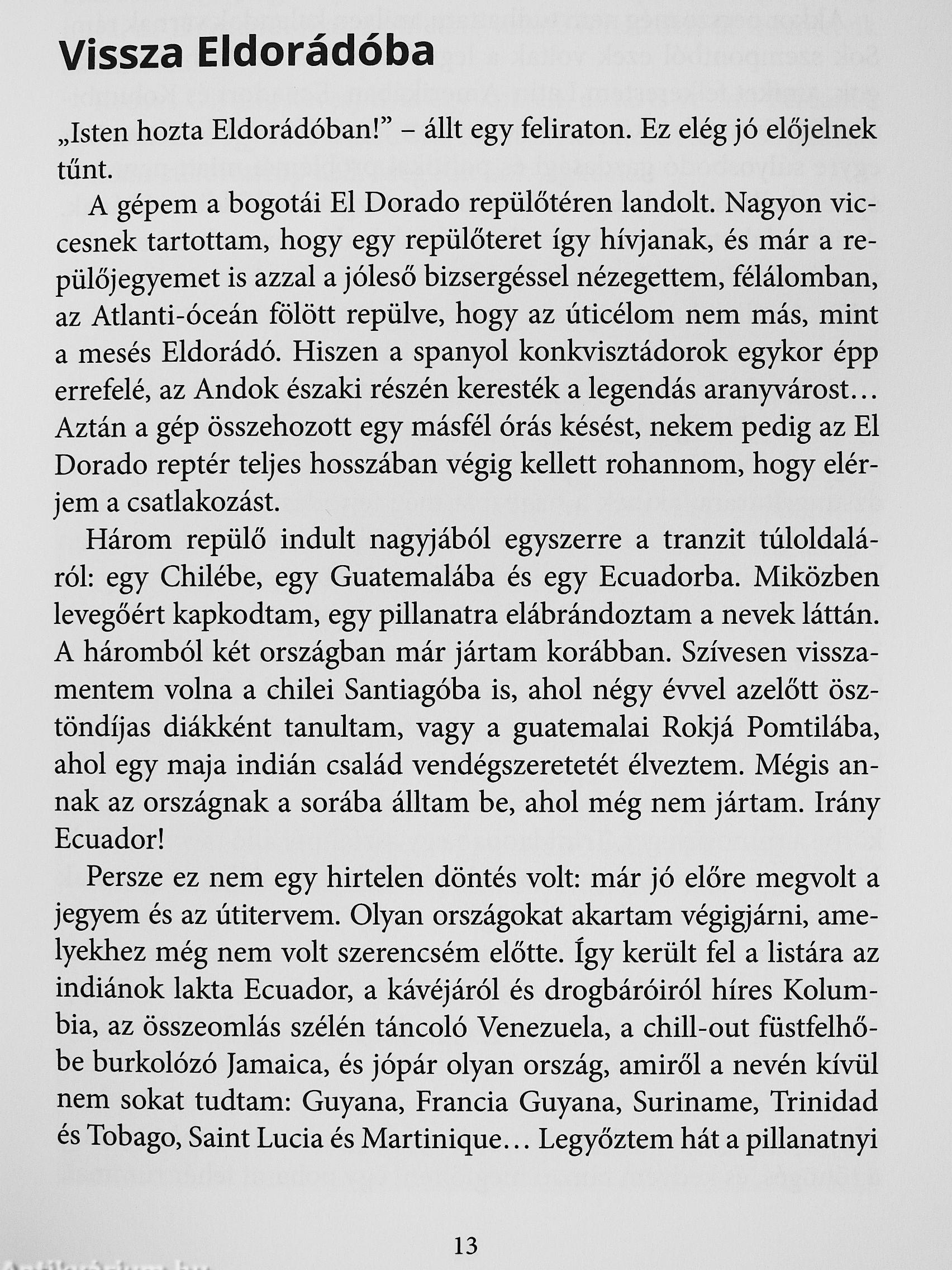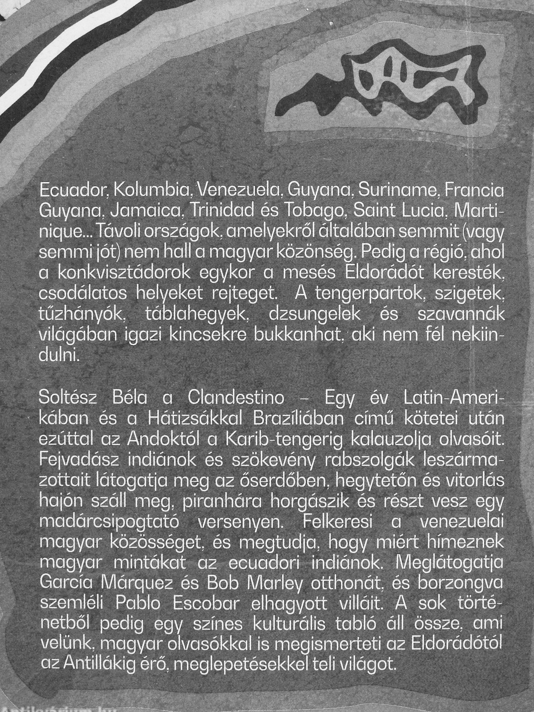 Soltész Béla a Glandestino - Egy év Latin-Amerikában és a Hátizsákkal Brazíliában című kötetei után ezúttal az Andoktól a Karib-tengerig kalauzolja olvasóit. Fejvadász indiánok és szökevény rabszolgák leszármazottait látogatja meg az őserdőben, hegytetőn és vitorlás hajón száll meg, piranhára horgászik és részt vesz egy madórcsipogtató versenyen. Felkeresi a venezuelai magyar közösséget, és megtudja, hogy miért hímeznek magyar mintákat az ecuadori indiánok. Meglátogatja Garcia Márquez és Bob Marley otthonát, és borzongva szemléli Pablo Escobar elhagyott villáit A sok történetből pedig egy színes kulturális tabló áll össze, ami velünk magyar olvasókkal is megismerteti az Eldorádótól az Antillákig érő, meglepetésekkel teli világot. Vissza