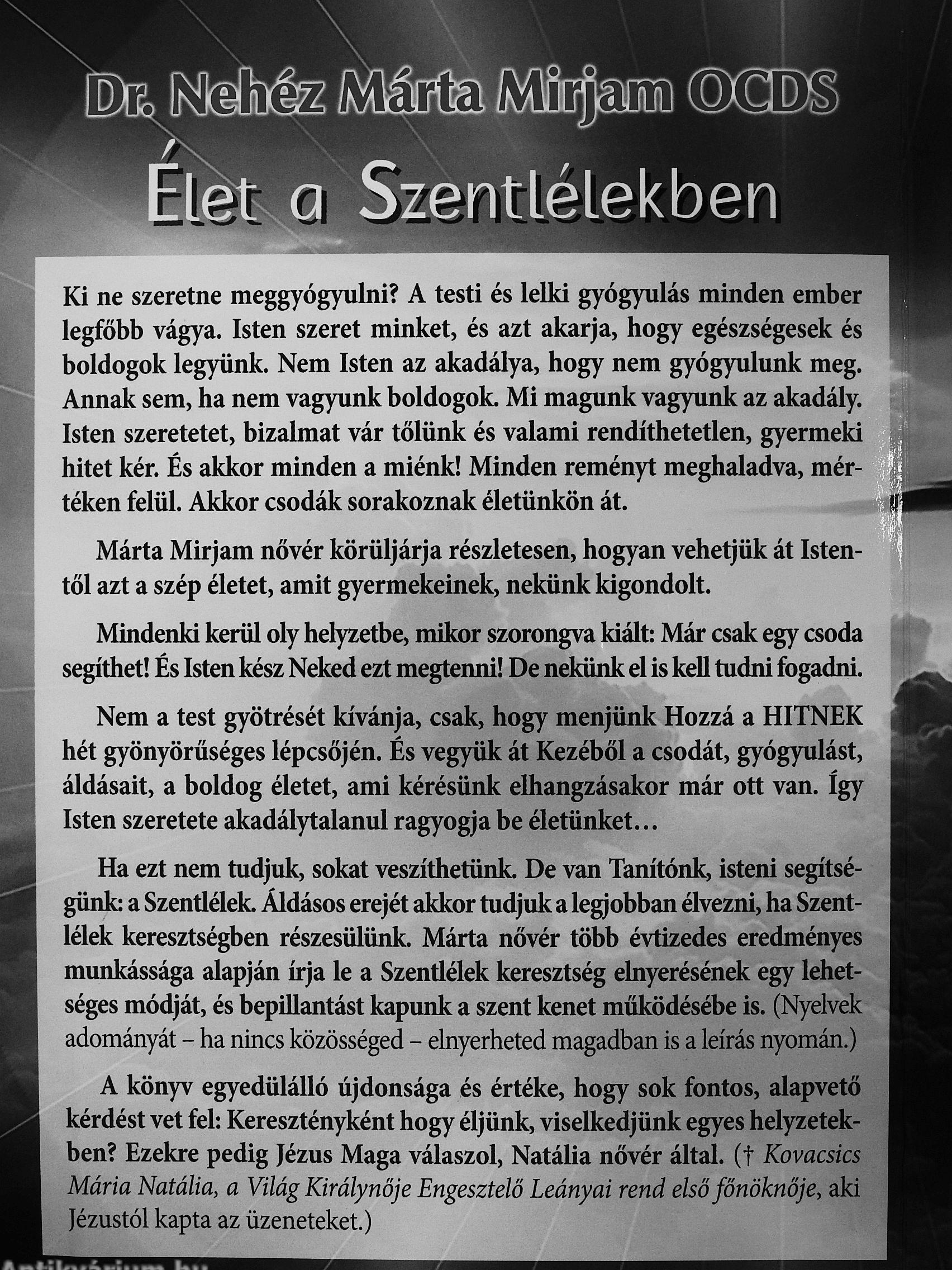 Ha ezt nem tudjuk, sokat veszíthetünk. De van Tanítónk, isteni segítségünk: a Szentlélek. Áldásos erejét akkor tudjuk a legjobban élvezni, ha Szentlélek keresztségben részesülünk. Márta nővér több évtizedes eredményes munkássága alapján írja le a Szentlélek keresztség elnyerésének egy lehetséges módját, és bepillantást kapunk a szent kenet működésébe is. (Nyelvek adományát - ha nincs közösséged - elnyerheted magadban is a leírás nyomán.)