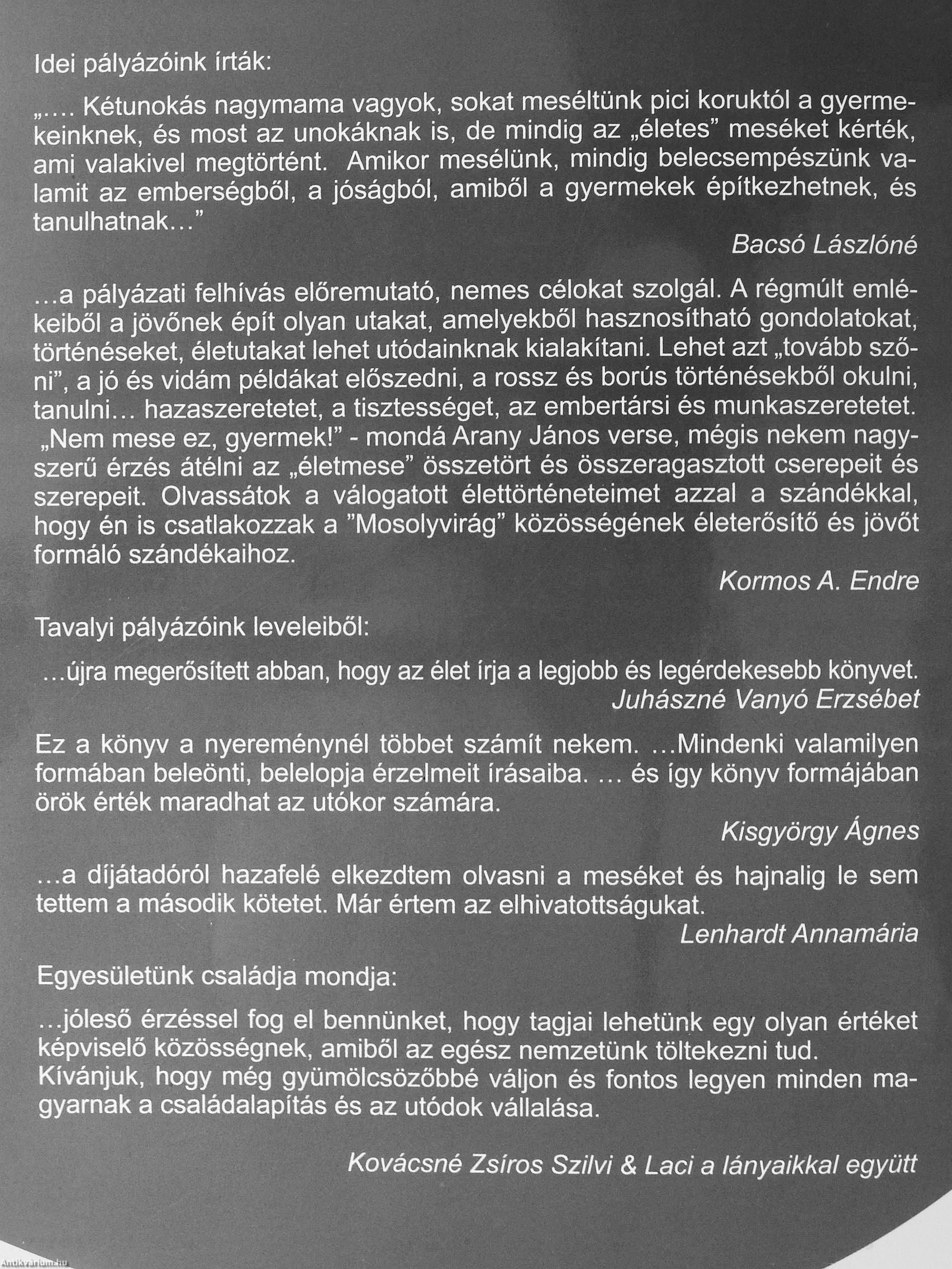 a pályázati felhívás előremutató, nemes célokat szolgál. A régmúlt emlékeiből a jövőnek épít olyan utakat, amelyekből hasznosítható gondolatokat, történéseket, életutakat lehet utódainknak kialakítani. Lehet azt „tovább szőni", a jó és vidám példákat előszedni, a rossz és borús történésekből okulni, tanulni hazaszeretetet, a tisztességet, az embertársi és munkaszeretetet. „Nem mese ez, gyermek!" - mondá Arany János verse, mégis nekem nagyszerű érzés átélni az „életmese" összetört és összeragasztott cserepeit és szerepeit. Olvassátok a válogatott élettörténeteimet azzal a szándékkal, hogy én is csatlakozzak a "Mosolyvirág" közösségének életerösítő és jövőt formáló szándékaihoz.