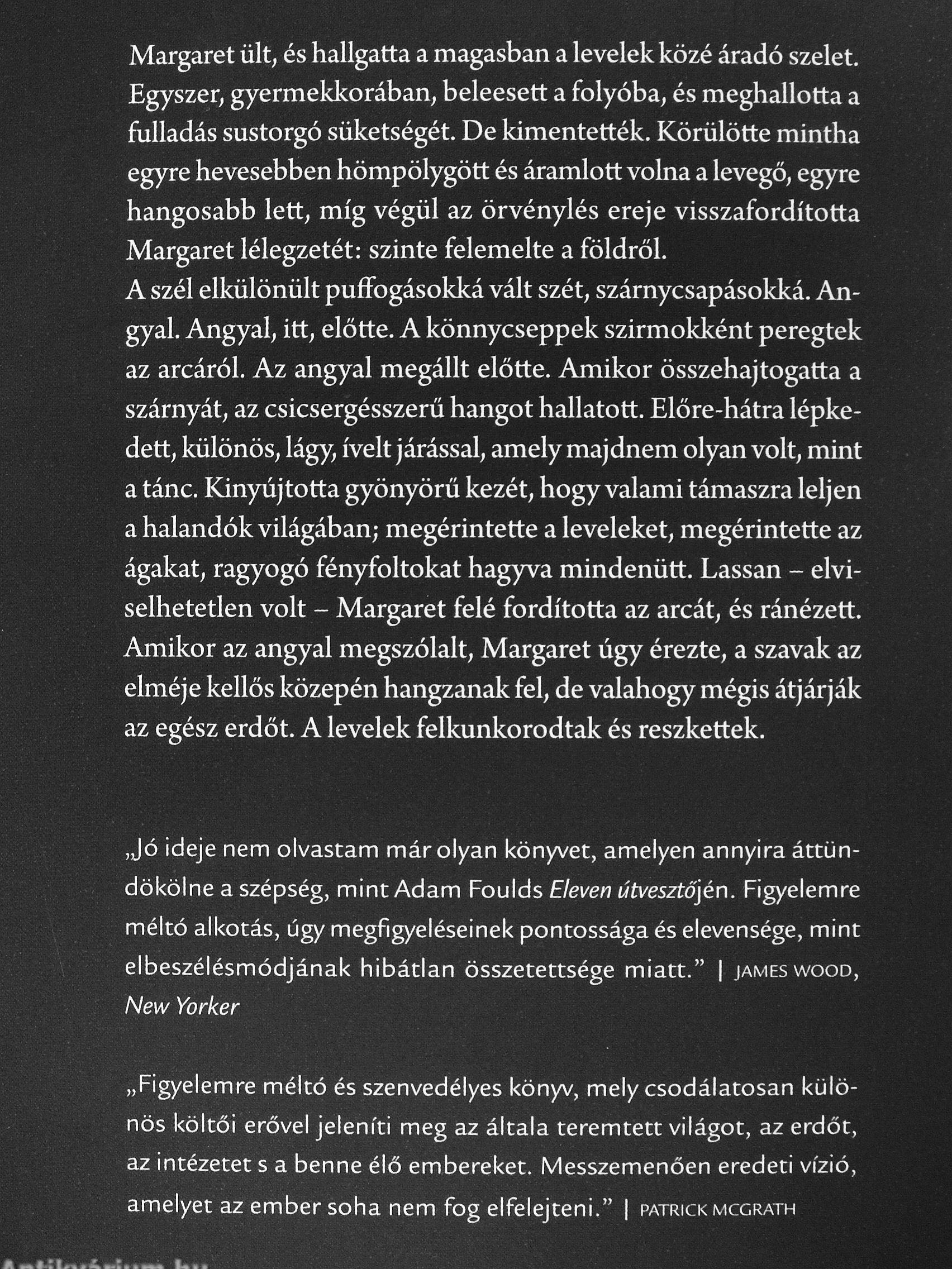 Margaret ült, és hallgatta a magasban a levelek közé áradó szelet. Egyszer, gyermekkorában, beleesett a folyóba, és meghallotta a fulladás sustorgó süketségét. De kimentették. Körülötte mintha egyre hevesebben hömpölygött és áramlott volna a levegő, egyre hangosabb lett, míg végül az örvénylés ereje visszafordította Margaret lélegzetét: szinte felemelte a földről. A szél elkülönült puffogásokká vált szét, szárnycsapásokká. Angyal. Angyal, itt, előtte. A könnycseppek szirmokként peregtek az arcáról. Az angyal megállt előtte. Amikor összehajtogatta a szárnyát, az csicsergésszerű hangot hallatott. Előre-hátra lépkedett, különös, lágy, ívelt járással, amely majdnem olyan volt, mint a tánc. Kinyújtotta gyönyörű kezét, hogy valami támaszra leljen a halandók világában; megérintette a leveleket, megérintette az ágakat, ragyogó fényfoltokat hagyva mindenütt. Lassan - elviselhetetlen volt - Margaret felé fordította az arcát, és ránézett. Amikor az angyal megszólalt, Margaret úgy érezte, a szavak az elméje kellős közepén hangzanak fel, de valahogy mégis átjárják az egész erdőt. A levelek felkunkorodtak és reszkettek.
