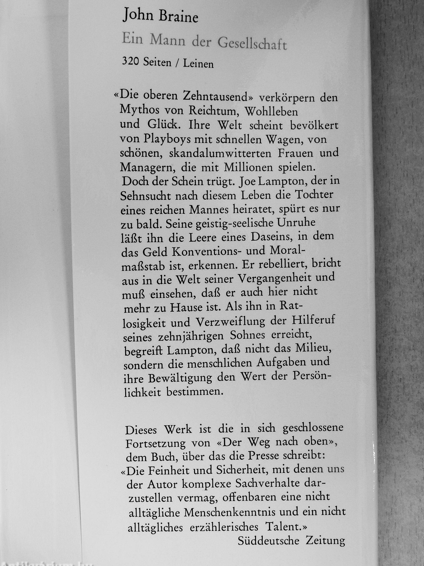 «Die oberen Zehntausend» verkörpern den Mythos von Reichtum, Wohlleben und Glück. Ihre Welt scheint bevölkert von Playboys mit schnellen Wagen, von schönen, skandalumwitterten Frauen und Managern, die mit Millionen spielen. Doch der Schein trügt. Joe Lampton, der in Sehnsucht nach diesem Leben die Tochter eines reichen Mannes heiratet, spürt es nur zu bald. Seine geistig-seelische Unruhe läßt ihn die Leere eines Daseins, in dem das Geld Konventions- und Moralmaßstab ist, erkennen. Er rebelliert, bricht aus in die Welt seiner Vergangenheit und muß einsehen, daß er auch hier nicht mehr zu Hause ist. Als ihn in Ratlosigkeit und Verzweiflung der Hilferuf seines zehnjährigen Sohnes erreicht, begreift Lampton, daß nicht das Milieu, sondern die menschlichen Aufgaben und ihre Bewältigung den Wert der Persönlichkeit bestimmen.