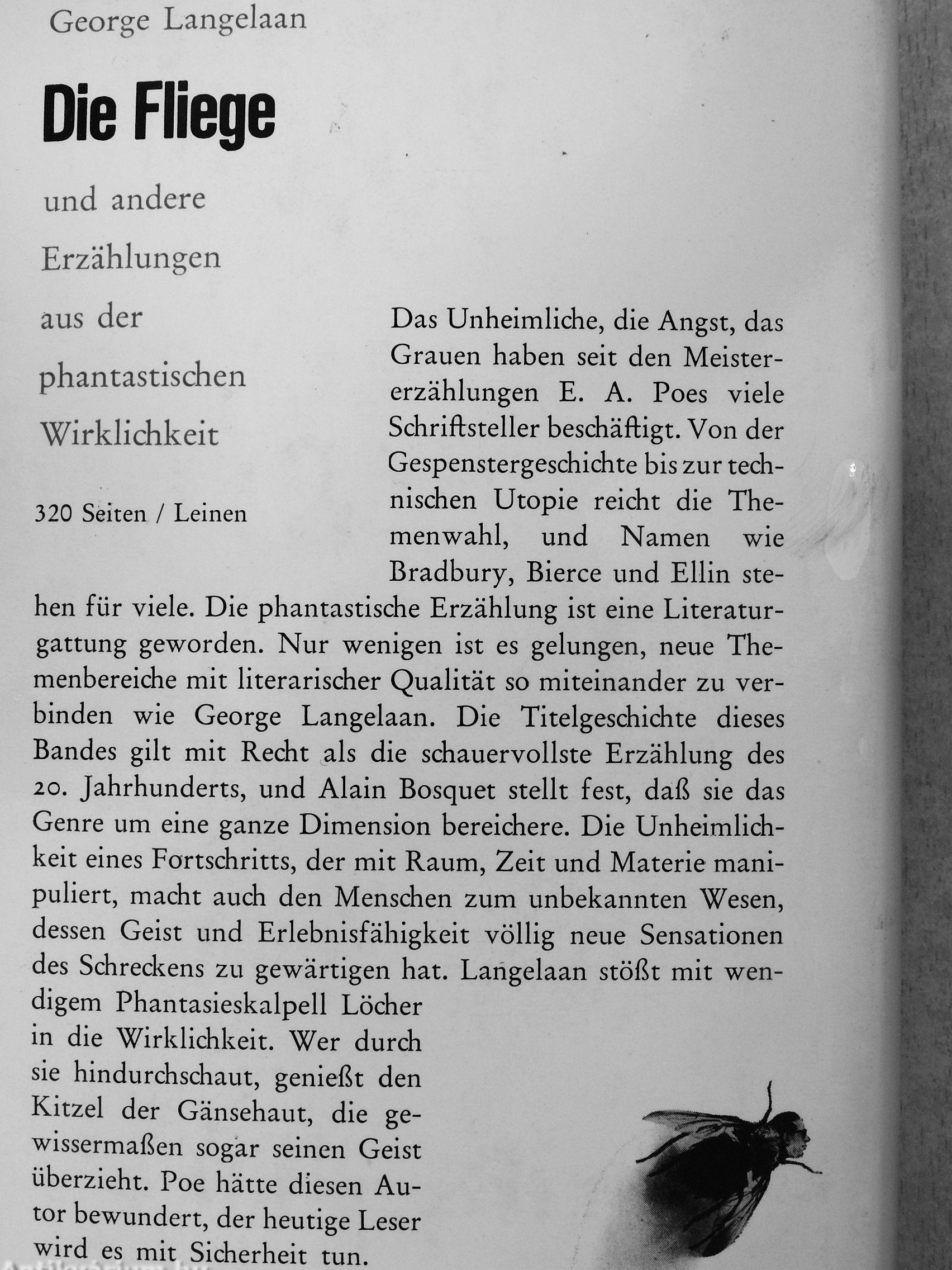 Das Unheimliche, die Angst, das Grauen haben seit den Meistererzählungen E. A. Poes viele Schriftsteller beschäftigt. Von der Gespenstergeschichte bis zur technischen Utopie reicht die Themenwahl, und Namen wie Bradbury, Bierce und Ellin stehen für viele. Die phantastische Erzählung ist eine Literaturgattung geworden. Nur wenigen ist es gelungen, neue Themenbereiche mit literarischer Qualität so miteinander zu verbinden wie George Langelaan. Die Titelgeschichte dieses Bandes gilt mit Recht als die schauervollste Erzählung des 20. Jahrhunderts, und Alain Bosquet stellt fest, daß sie das Genre um eine ganze Dimension bereichere. Die Unheimlich-keit eines Fortschritts, der mit Raum, Zeit und Materie manipuliert, macht auch den Menschen zum unbekannten Wesen, dessen Geist und Erlebnisfähigkeit völlig neue Sensationen des Schreckens zu gewärtigen hat. Langelaan stößt mit wendigem Phantasieskalpell Löcher in die Wirklichkeit. Wer durch sie hindurchschaut, genießt den Kitzel der Gänsehaut, die gewissermaßen sogar seinen Geist überzieht. Poe hätte diesen Autor bewundert, der heutige Leser wird es mit Sicherheit tun.