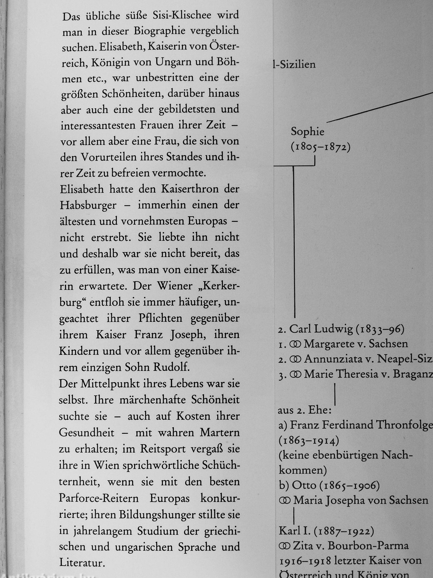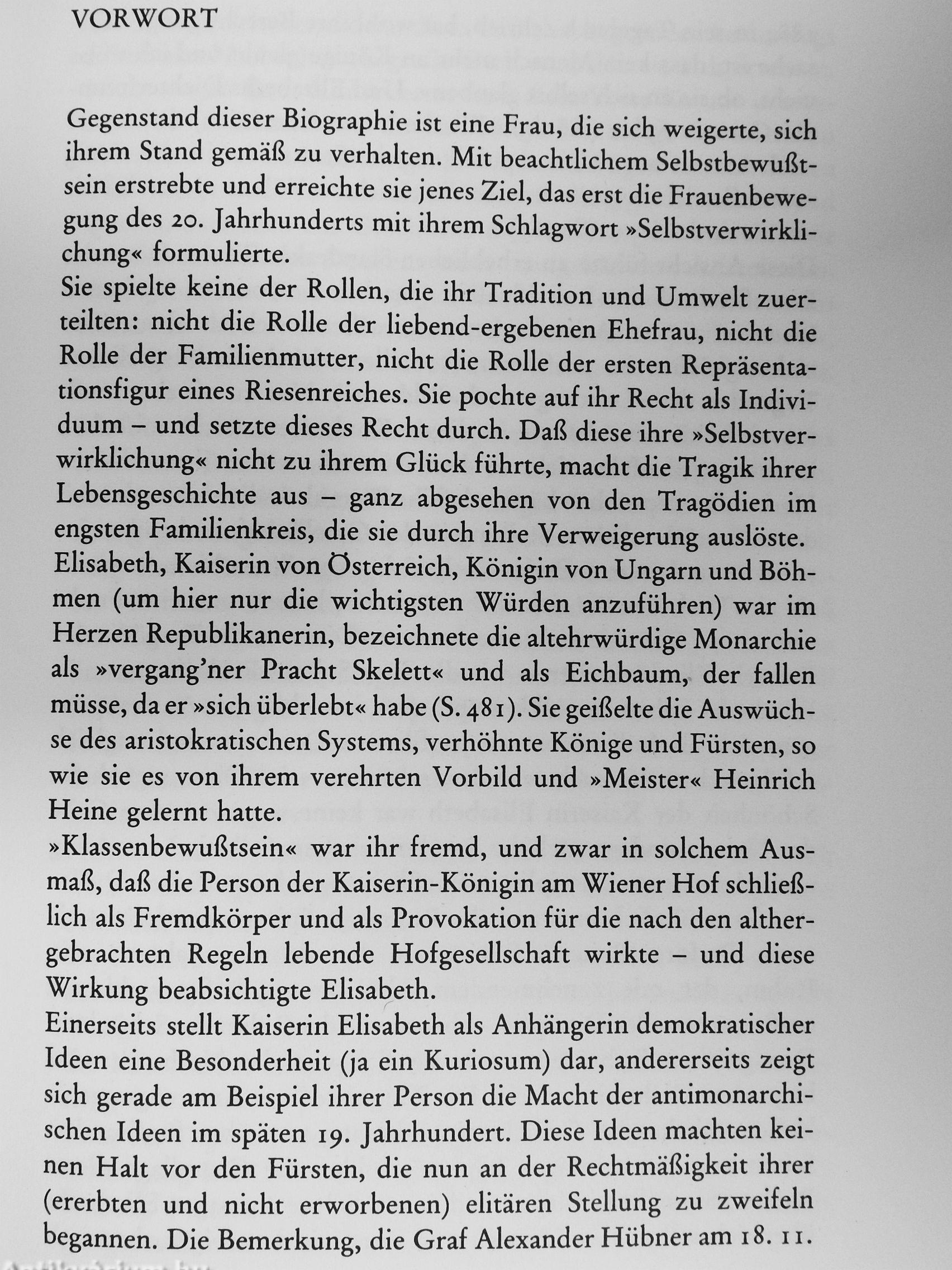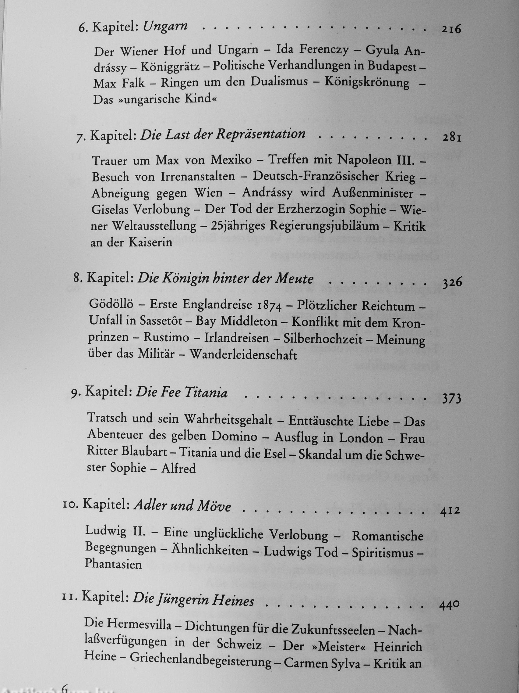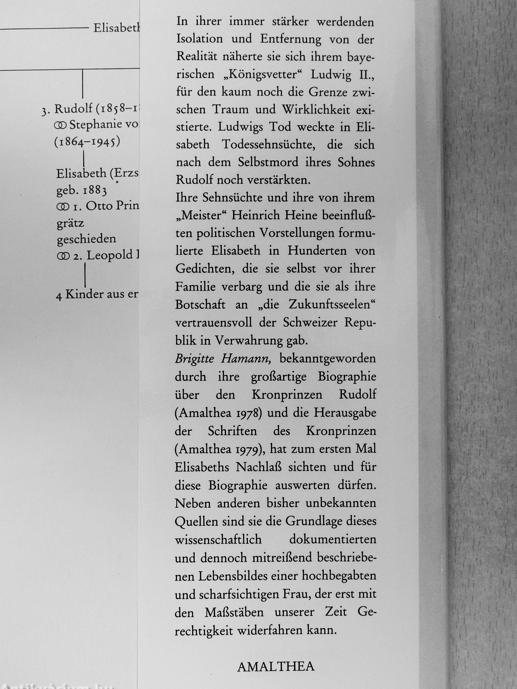 In ihrer immer stärker werdenden Isolation und Entfernung von der Realität näherte sie sich ihrem bayerischen „Königsvetter" Ludwig IL, für den kaum noch die Grenze zwischen Traum und Wirklichkeit existierte. Ludwigs Tod weckte in Elisabeth Todessehnsüchte, die sich nach dem Selbstmord ihres Sohnes Rudolf noch verstärkten. Ihre Sehnsüchte und ihre von ihrem „Meister" Heinrich Heine beeinflußten politischen Vorstellungen formulierte Elisabeth in Hunderten von Gedichten, die sie selbst vor ihrer Familie verbarg und die sie als ihre Botschaft an „die Zukunftsseelen" vertrauensvoll der Schweizer Republik in Verwahrung gab. Brigitte Hamann, bekanntgeworden durch ihre großartige Biographie über den Kronprinzen Rudolf (Amalthea 1978) und die Herausgabe der Schriften des Kronprinzen (Amalthea 1979), hat zum ersten Mal Elisabeths Nachlaß sichten und für diese Biographie auswerten dürfen. Neben anderen bisher unbekannten Quellen sind sie die Grundlage dieses wissenschaftlich dokumentierten und dennoch mitreißend beschriebenen Lebensbildes einer hochbegabten und scharfsichtigen Frau, der erst mit den Maßstäben unserer Zeit Gerechtigkeit widerfahren kann.