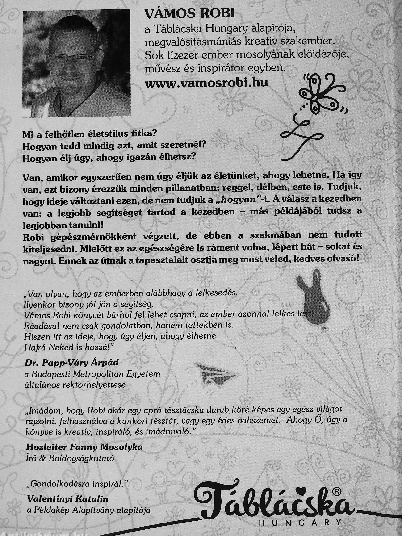 Vámos Robi könyvét bárhol fel lehet csapni, az ember azonnal lelkes Ráadásul nem csak gondolatban, hanem tettekben is. Hiszen itt az ideje, hogy úgy éljen, ahogy élhetne. Hajrá Neked is hozzá!"