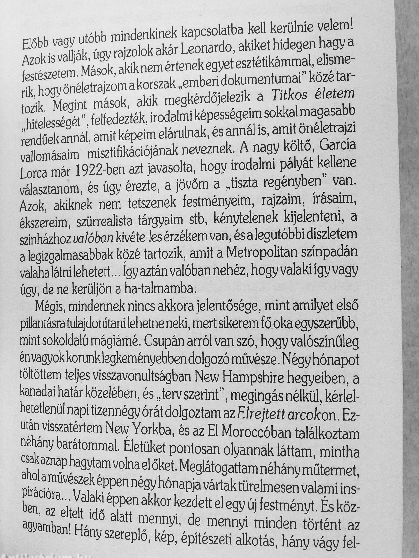 "Előbb-utóbb mindenki megismerkedik velem. Ezt a regényt azoknak is el kell olvasniuk, akiket hidegen hagynak festményeim, akik nem törődnek rajzaimmal, szürrealista tárgyaimmal és ékszereimmel..." Vissza