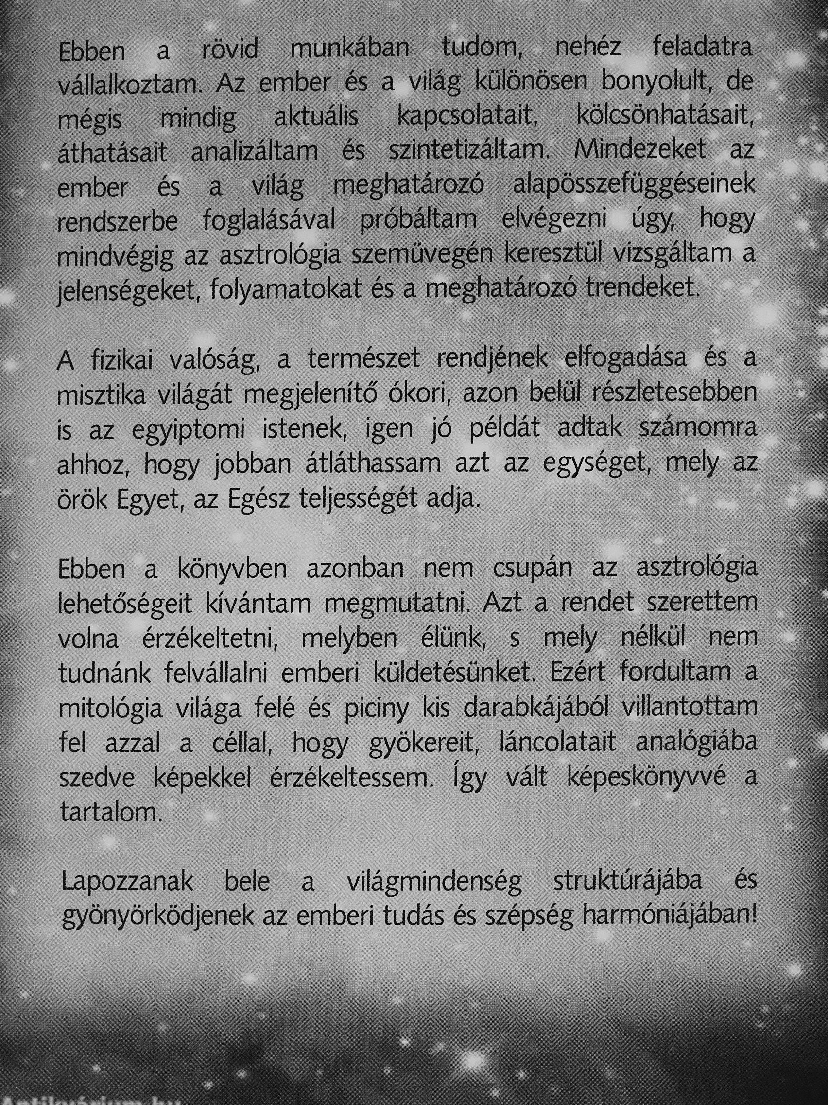 Ebben a könyvben azonban nem csupán az asztrológia lehetőségeit kívántam megmutatni. Azt a rendet szerettem volna érzékeltetni, melyben élünk, s mely nélkül nem tudnánk felvállalni emberi küldetésünket. Ezért fordultam a mitológia világa felé és piciny kis darabkájából villantottam fel azzal... Tovább