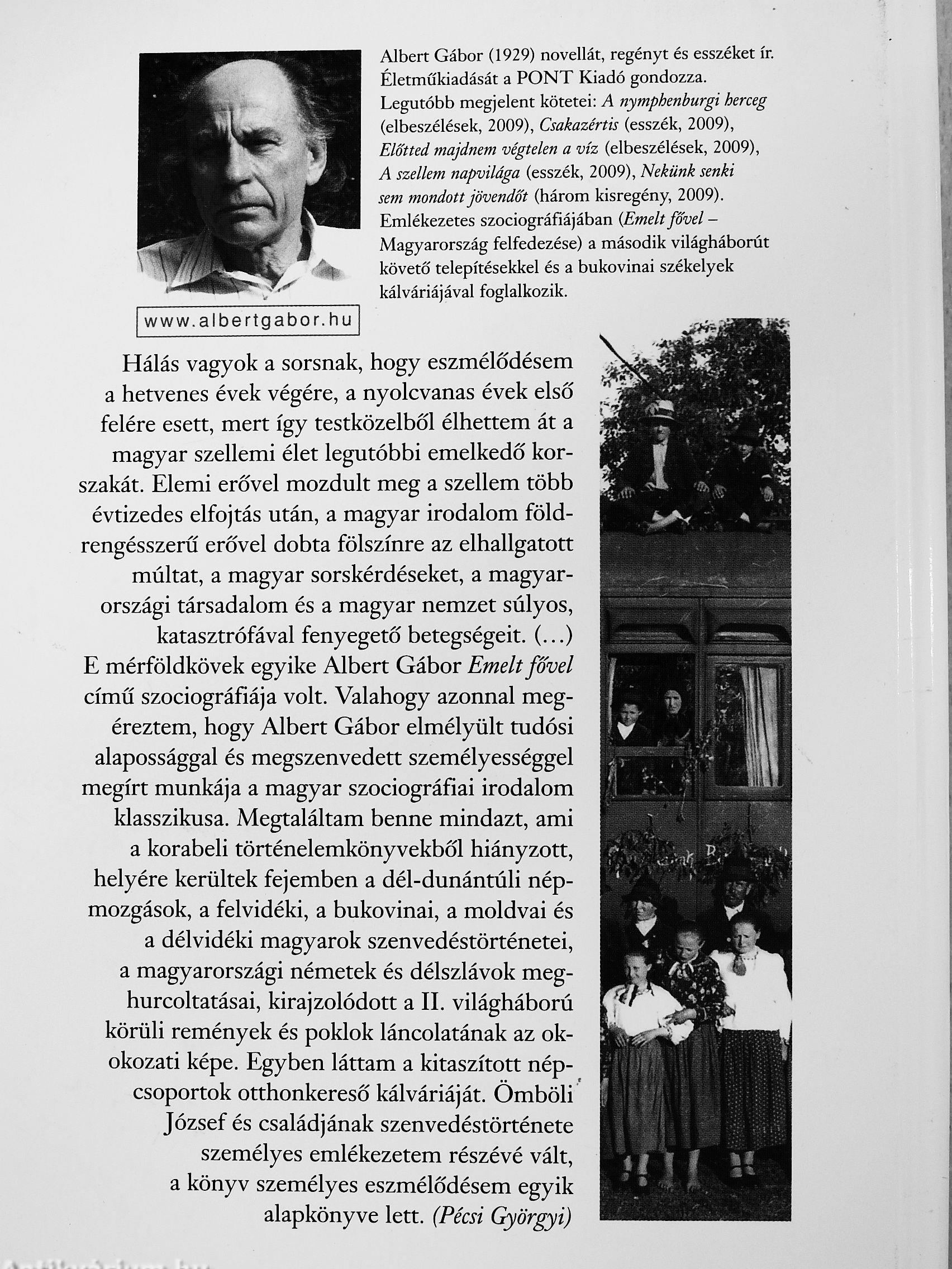 Hálás vagyok a sorsnak, hogy eszmélődésem a hetvenes évek végére, a nyolcvanas évek első felére esett, mert így testközelből élhettem át a magyar szellemi élet legutóbbi emelkedő korszakát. Elemi erővel mozdult meg a szellem több évtizedes elfojtás után, a magyar irodalom földrengésszerű erővel dobta fölszínre az elhallgatott múltat, a magyar sorskérdéseket, a magyarországi társadalom és a magyar nemzet stilyos, katasztrófával fenyegető betegségeit. ( ) E mérföldkövek egyike Albert Gábor Emelt fővel című szociográfiája volt. Valahogy azonnal megéreztem, hogy Albert Gábor elmélyült tudósi alapossággal és megszenvedett személyességgel megírt munkája a magyar szociográfiai irodalom klasszikusa. Megtaláltam benne mindazt, ami a korabeli történelemkönyvekből hiányzott, helyére kerültek fejemben a dél-dunántúli népmozgások, a felvidéki, a bukovinai, a moldvai és a délvidéki magyarok szenvedéstörténetei, a magyarországi németek és délszlávok meghurcoltatásai, kirajzolódott a II. világháború körüli remények és poklok láncolatának az ok-okozati képe. Egyben láttam a kitaszított népcsoportok otthonkereso kálváriáját. Ömböli József és családjának szenvedéstörténete személyes emlékezetem részévé vált, a könyv személyes eszmélődésem egyik alapkönyve lett. (Pécsi Györgyi) Vissza