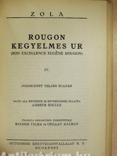 Zola nagy regénysorozata első művét, a La Fortune des Rougon-t 1868 telén kezdte írni és 1869 májusában fejezte be, de csak 1870 június végén jutott ahhoz, hogy munkájának első fejezetei megjelenhessenek, a Le Siécle című lapban. Három héttel később kitört a háború, a lap a regény közlését megszakította és folytatásának meg végének kiadását csak nyolc hónappal később kezdte meg. Zola tehát még alig fogott hozzá regénysorozata részletesen kidolgozott tervének megvalósításához, azt az uralmat, amelyet vádolni akart, már elítélte és kivégezte a sors. Mire hatodik művének, Son Excellence Eugéne Rougon-nak megírására került a sor, minden izgalom és harag nélkül, a történetíró nyugalmával gondolhatott arra a letűnt uralomra, melynek vezetőit és támaszait akarta bírálgatni ebben a könyvében. Így nem forgott abban a veszedelemben, ha nagy tehetsége nem is óvta volna meg ettől, hogy a második császárság előkelőségeit jellemző munkája olyan, idővel értéktelen pamfletté váljék, amilyen például a Zolát kicsinylő Léon Daudet akárhány regénye.
