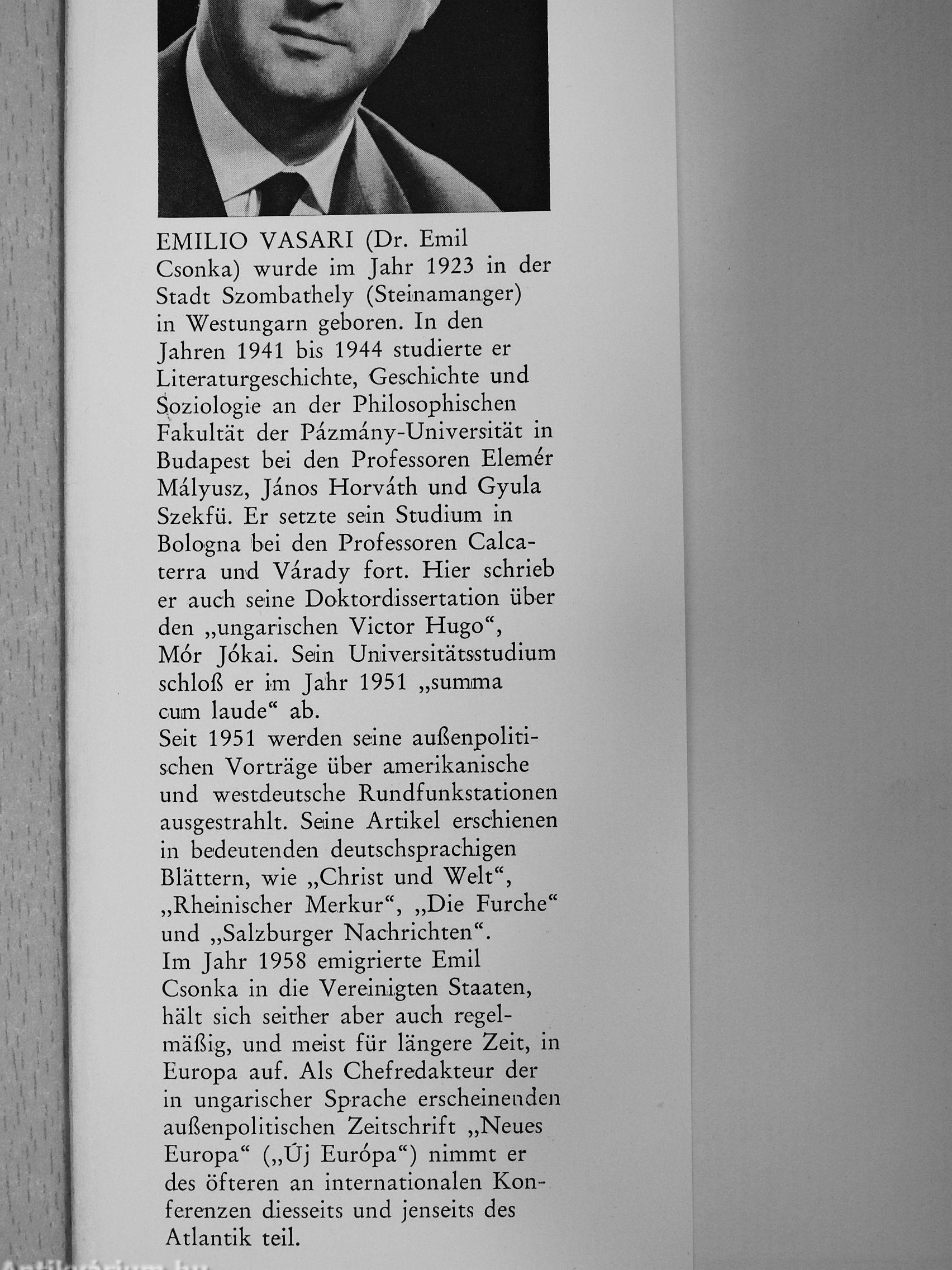 EMILIO VASARI (Dr. Emil Csonka) wurde im Jahr 1923 in der Stadt Szombathely (Steinamanger) in Westungarn geboren. In den Jahren 1941 bis 1944 studierte er Literaturgeschichte, Geschichte und Soziologie an der Philosophischen Fakultät der Pázmány-Universitat in Budapest bei den Professoren Elemér Mályusz, János Horváth und Gyula Szekfü. Er setzte sein Studium in Bologna bei den Professoren Calca-terra und Várady fort. Hier schrieb er auch seine Doktordissertation über den „ungarischen Victor Hugo", Mór Jókai. Sein Universitätsstudium schloß er im Jahr 1951 „summa cum laude" ab.