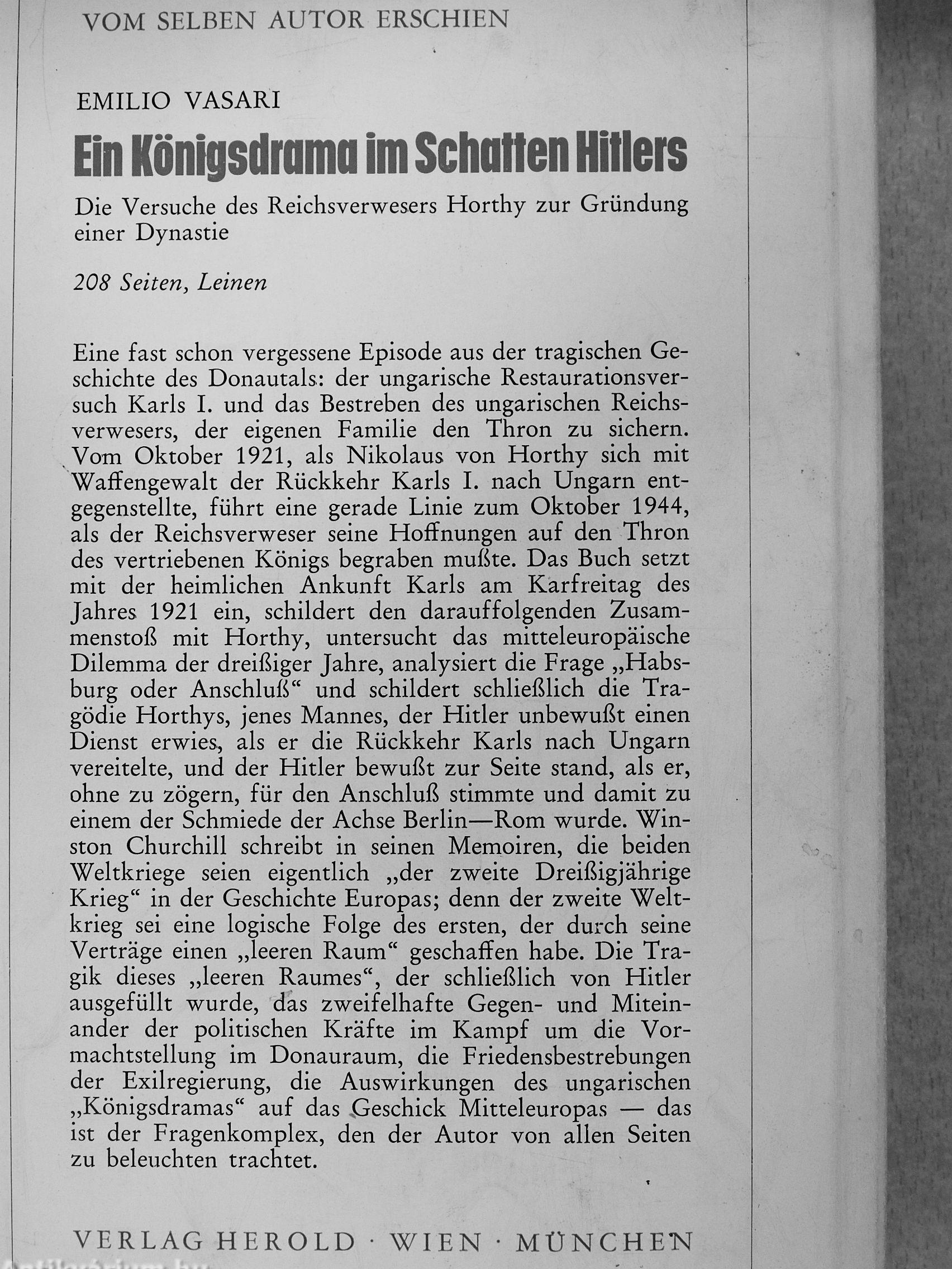 Eine fast schon vergessene Episode aus der tragischen Geschichte des Donautals: der ungarische Restaurationsversuch Karls I. und das Bestreben des ungarischen Reichsverwesers, der eigenen Familie den Thron zu sichern. Vom Oktober 1921, als Nikolaus von Horthy sich mit Waffengewalt der Rückkehr Karls I. nach Ungarn entgegenstellte, führt eine gerade Linie zum Oktober 1944, als der Reichsverweser seine Hoffnungen auf den Thron des vertriebenen Königs begraben mußte. Das Buch setzt mit der heimlichen Ankunft Karls am Karfreitag des Jahres 1921 ein, schildert den darauffolgenden Zusammenstoß mit Horthy, untersucht das mitteleuropäische Dilemma der dreißiger Jahre, analysiert die Frage „Habsburg oder Anschluß" und schildert schließlich die Tragödie Horthys, jenes Mannes, der Hitler unbewußt einen Dienst erwies, als er die Rückkehr Karls nach Ungarn vereitelte, und der Hitler bewußt zur Seite stand, als er, ohne zu zögern, für den Anschluß stimmte und damit zu einem der Schmiede der Achse Berlin—Rom wurde. Win-ston Churchill schreibt in seinen Memoiren, die beiden Weltkriege seien eigentlich „der zweite Dreißigjährige Krieg" in der Geschichte Europas; denn der zweite Weltkrieg sei eine logische Folge des ersten, der durch seine Verträge einen „leeren Raum" geschaffen habe. Die Tragik dieses „leeren Raumes", der schließlich von Hitler ausgefüllt wurde, das zweifelhafte Gegen- und Miteinander der politischen Kräfte im Kampf um die Vormachtstellung im Donauraum, die Friedensbestrebungen der Exilregierung, die Auswirkungen des ungarischen „Königsdramas" auf das Geschick Mitteleuropas — das ist der Fragenkomplex, den der Autor von allen Seiten zu beleuchten trachtet.