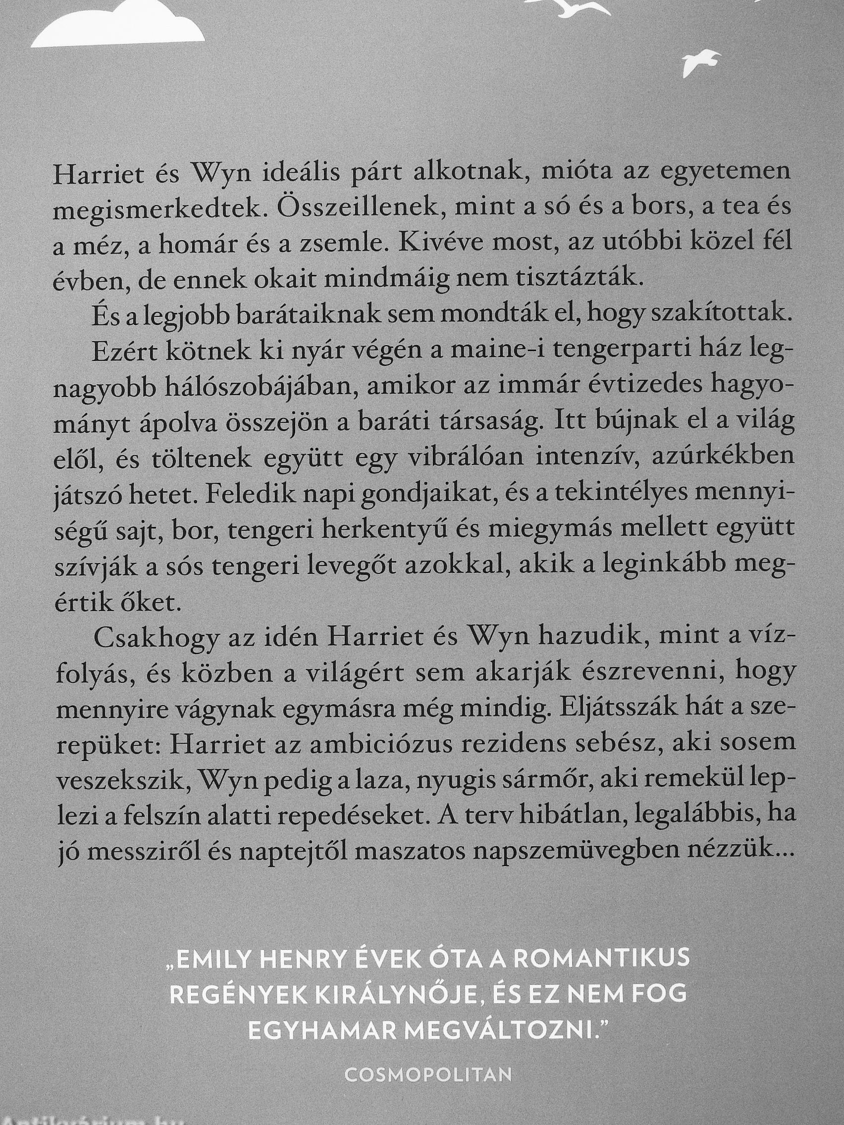 Csakhogy az idén Harriet és Wyn hazudik, mint a vízfolyás, és közben a világért sem akarják észrevenni, hogy mennyire vágynak egymásra még mindig. Eljátsszák hát a szerepüket: Harriet az ambiciózus rezidens sebész, aki sosem veszekszik, Wyn pedig a laza, nyugis sármőr, aki remekül leplezi a felszín alatti repedéseket. A terv hibátlan, legalábbis, ha jó messziről és naptejtől maszatos napszemüvegben nézzük