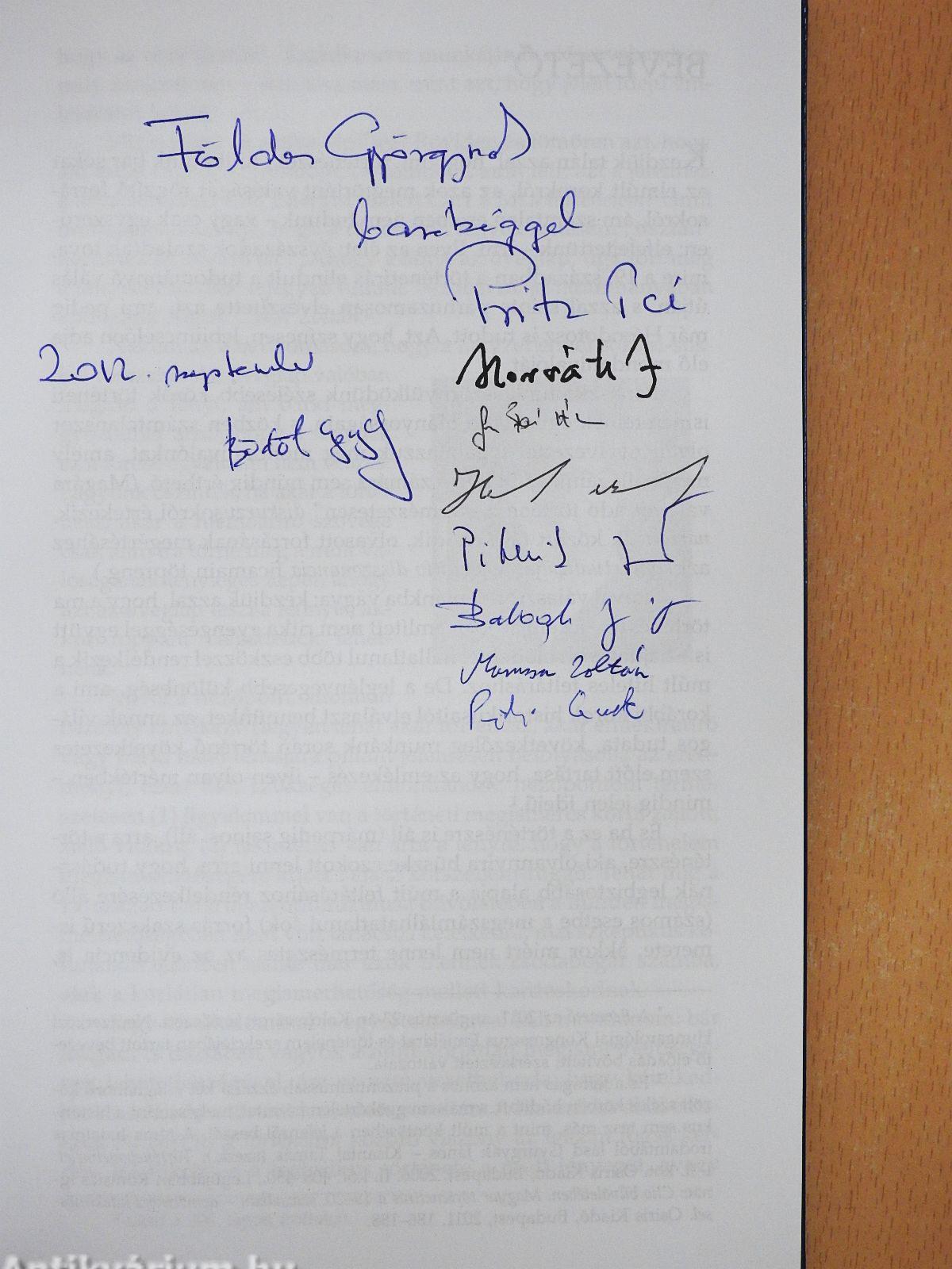 Az egyik lapon a szerző és szerkesztő, Pritz Pál és Horváth Jenő valamint a szerzők, Pihurik Judit, Balogh Margit, Maruzsa Zoltán, Püski Levente, és Bödők Gergely és további 2 személy dedikációja látható.