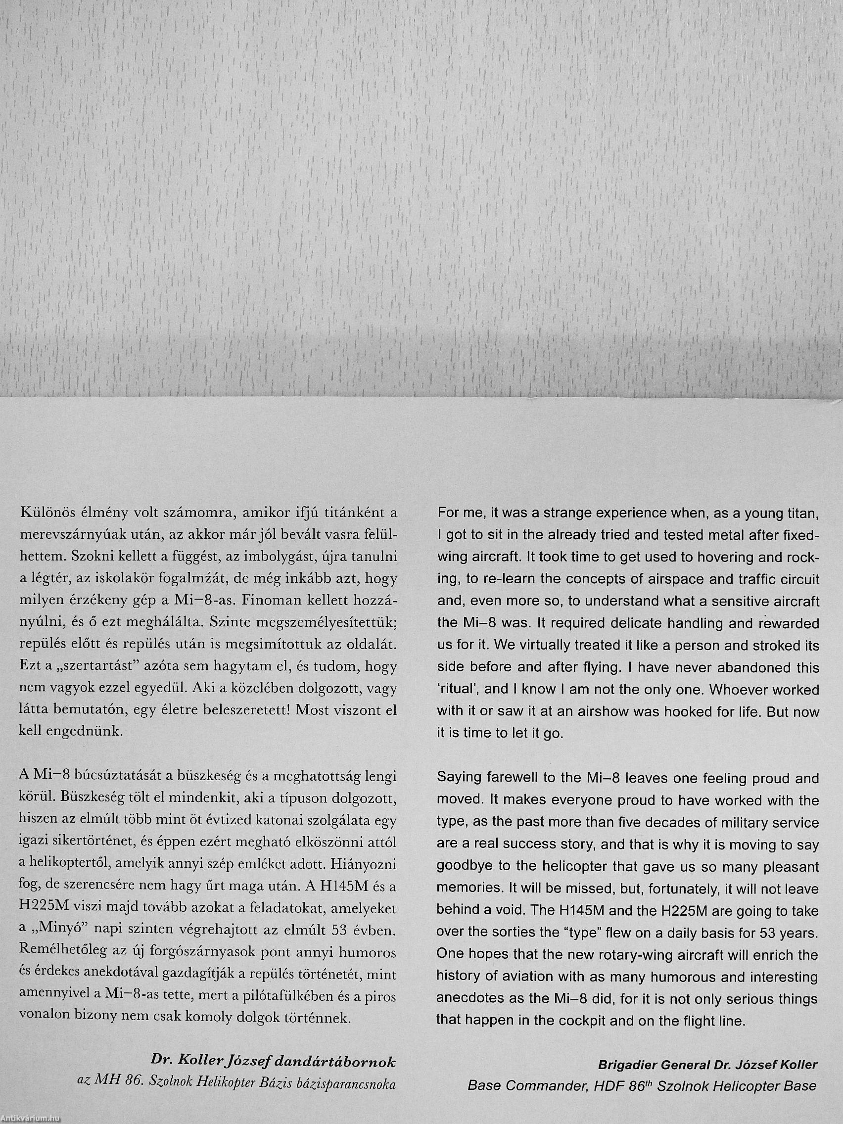 Különös élmény volt számomra, amikor ifjú titánként a merevszárnyúak után, az akkor már jól bevált vasra felülhettem. Szokni kellett a függést, az imbolygást, újra tanulni a légtér, az iskolakör fogalmzát, de még inkább azt, hogy milyen érzékeny gép a Mi-8-as. Finoman kellett hozzányúlni, és ő ezt meghálálta. Szinte megszemélyesítettük; repülés előtt és repülés után is megsimítottuk az oldalát. Ezt a „szertartást" azóta sem hagytam el, és tudom, hogy nem vagyok ezzel egyedül. Aki a közelében dolgozott, vagy látta bemutatón, egy életre beleszeretett! Most viszont el kell engednünk.
