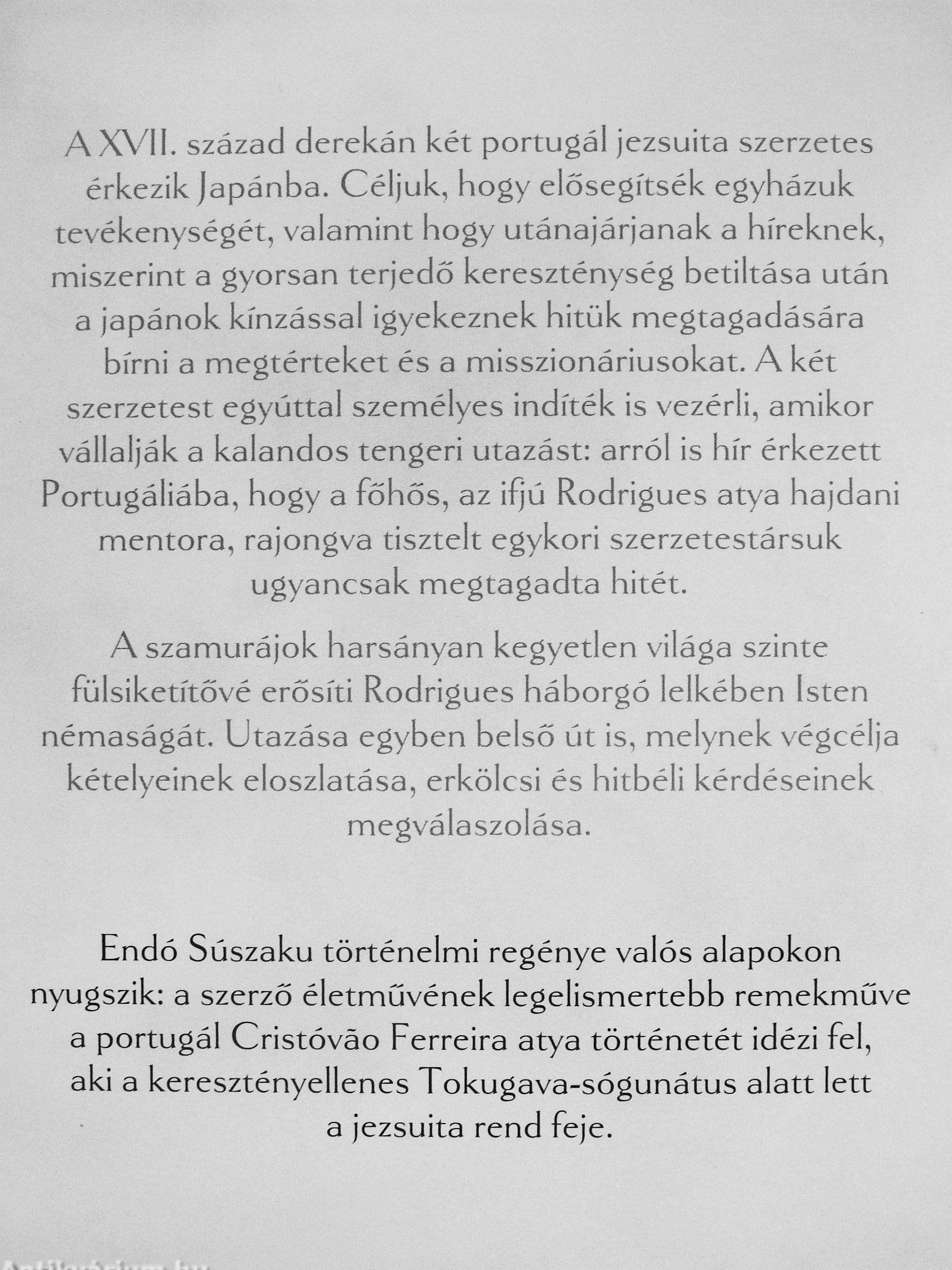 Endó Súszaku történelmi regénye valós alapokon nyugszik: a szerző életművének legelismertebb remekműve a portugál Cristóváo Ferreira atya történetét idézi fel, aki a keresztényellenes...