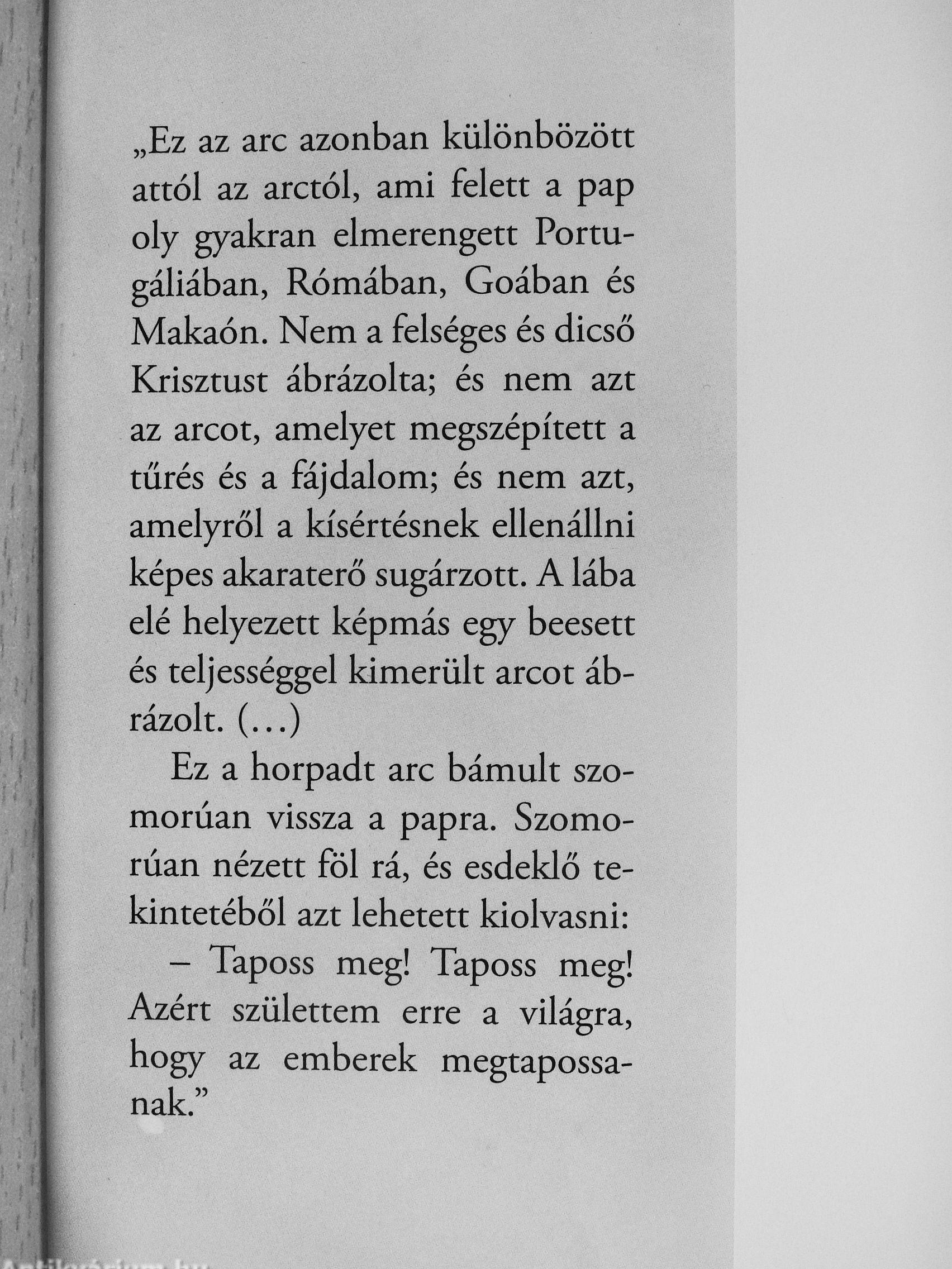 „Ez az arc azonban különbözött attól az arctól, ami felett a pap oly gyakran elmerengett Portugáliában, Rómában, Goában és Makaón. Nem a felséges és dicső Krisztust ábrázolta; és nem azt az arcot, amelyet megszépített a tűrés és a fájdalom; és nem azt, amelyről a kísértésnek ellenállni képes akaraterő sugárzott. A lába elé helyezett képmás egy beesett és teljességgel kimerült arcot ábrázolt. ( )