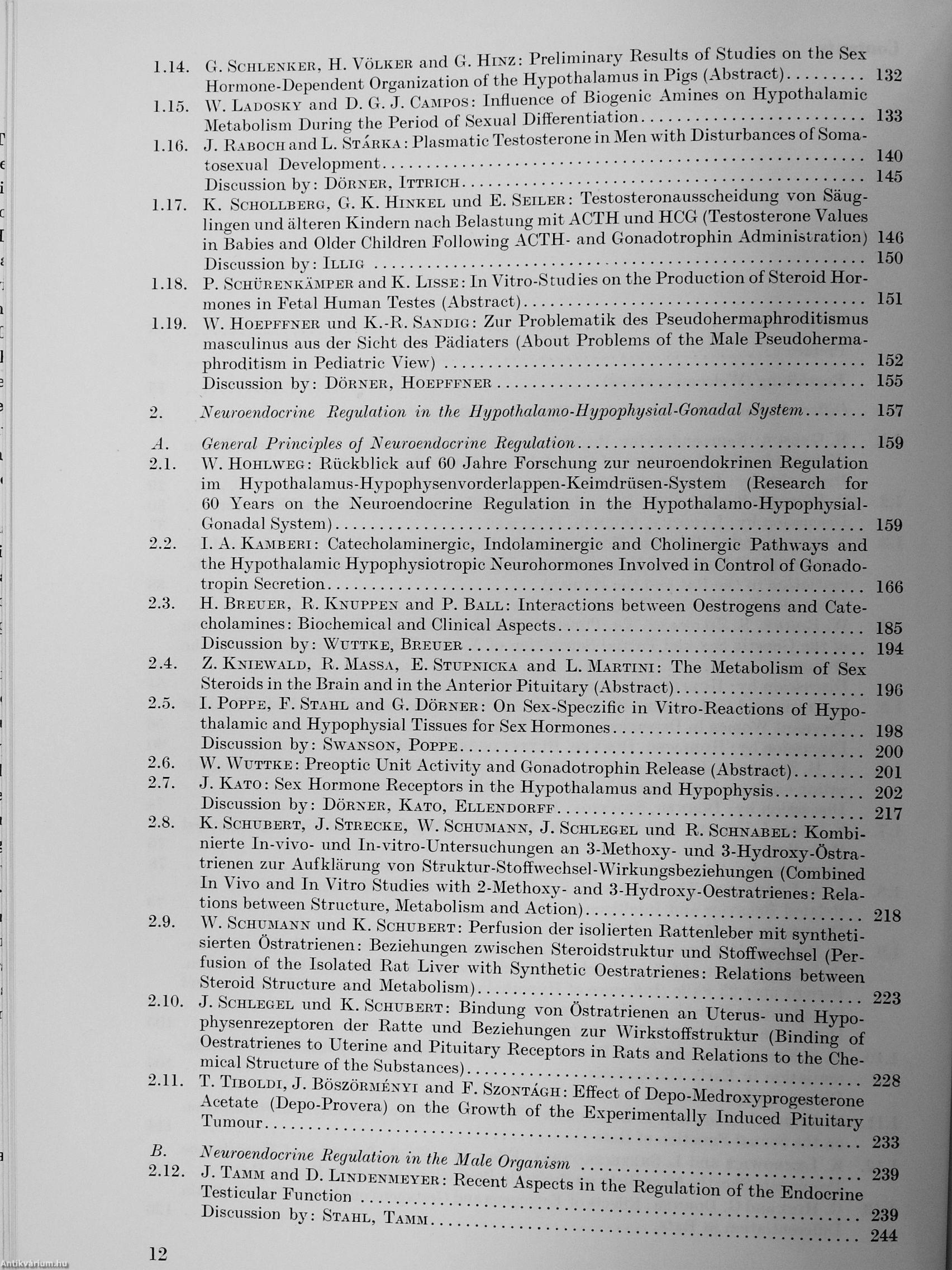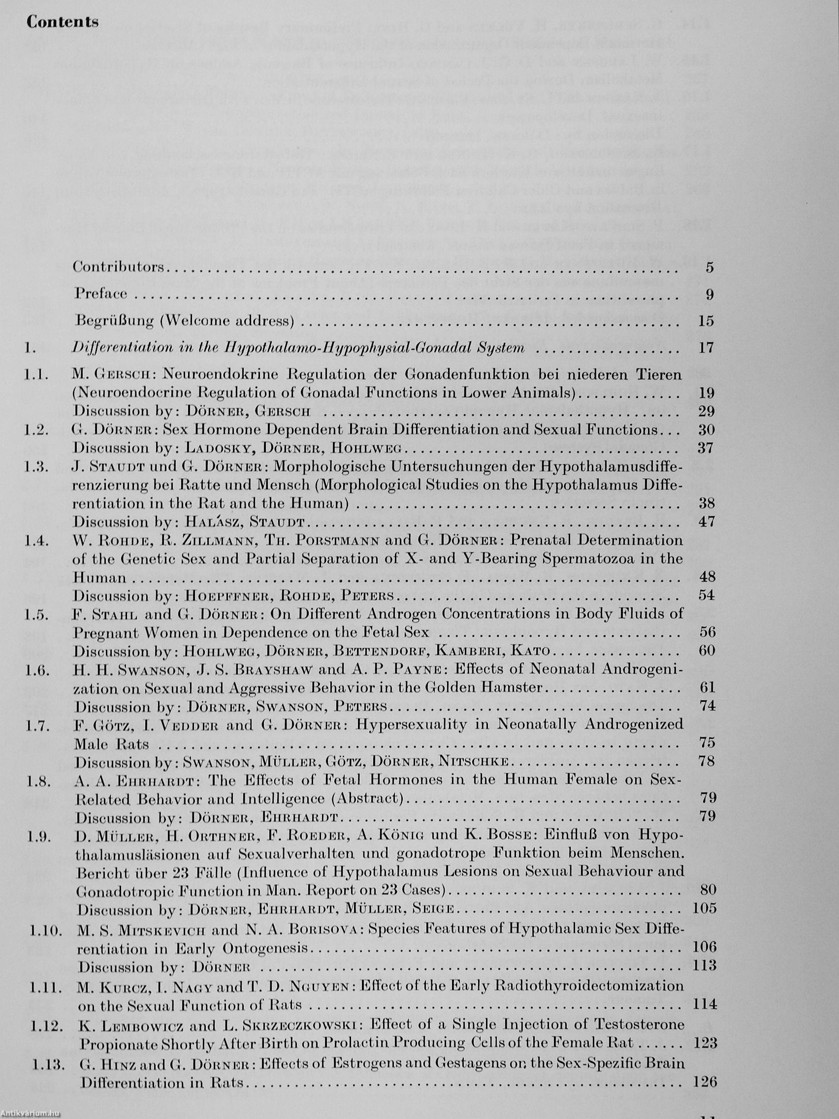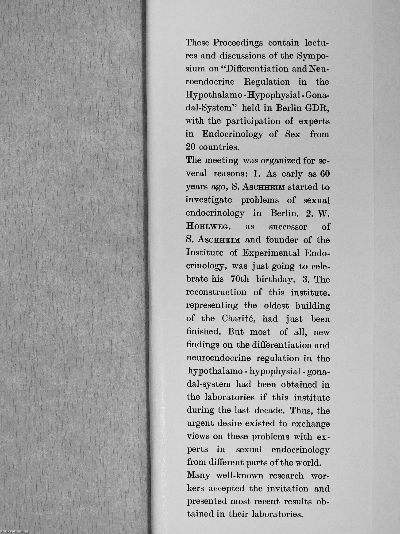 The meeting was organized for several reasons: 1. As early as 60 years ago, S. Aschheim started to investigate problems of sexual endocrinology in Berlin, 2. W. Hohlweg, as successor of S. Aschheim and founder of the Institute of Experimental Endocrinology, was just going to celebrate his 70th birthday. 3. The reconstruction of this institute, representing the oldest building of the Charité, had just been finished. But most of all, new findings on the diiferentiation and neuroendocrine regulation in the hypothalamo - hypophysial - gona-dal-system had been obtained in the laboratories if this institute during the last decade. Thus, the urgent desire existed to exchange views on these problems with experts in sexual...