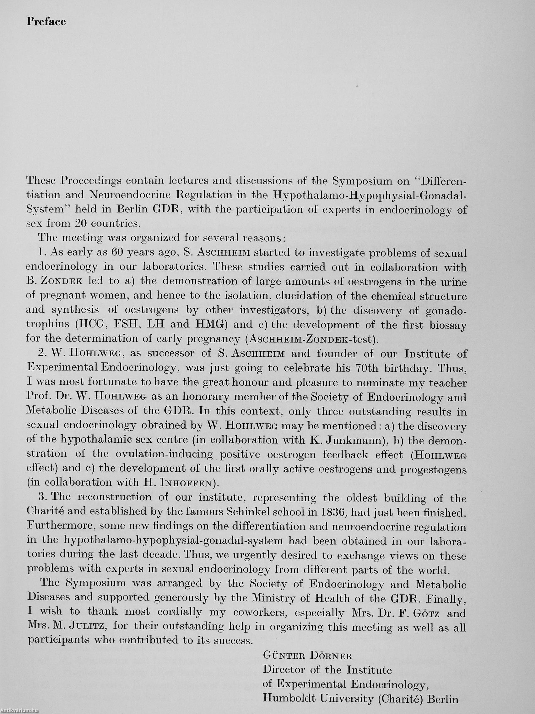 The meeting was organized for several reasons: 1. As early as 60 years ago, S. Aschheim started to investigate problems of sexual endocrinology in Berlin, 2. W. Hohlweg, as successor of S. Aschheim and founder of the Institute of Experimental Endocrinology, was just going to celebrate his 70th birthday. 3. The reconstruction of this institute, representing the oldest building of the Charité, had just been finished. But most of all, new findings on the diiferentiation and neuroendocrine regulation in the hypothalamo - hypophysial - gona-dal-system had been obtained in the laboratories if this institute during the last decade. Thus, the urgent desire existed to exchange views on these problems with experts in sexual endocrinology from diiferent parts of the world. Many well-known research workers accepted the invitation and presented most recent results obtained in their laboratories.