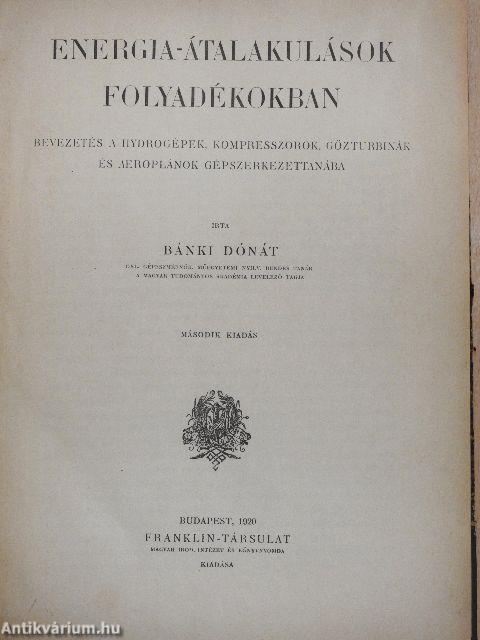 Sok gépnek munkaközege folyadék, nevezetesen: víz, levegő, vízgőz. Mindezeket mótorok és generátorok nemébe osztályozhatjuk. Valamennyit az jellemzi, hogy bennük és általuk, valamint a velük összefüggésben levő berendezésekben a folyadékenergiák különböző alakokat öltenek, munkává alakulnak és viszont. Az ide tartozó gépeket nagy sokaságuk miatt csak úgy tekinthetjük át és szerkezeteikkel, valamint működésük elméleti alapelveivel csak úgy ismerkedhetünk meg túlságosan nagy időpazarlás nélkül, ha a különböző géptipusokat jellemző tulajdonságaik szerint összefoglalva és elméletüket közös alapra helyezve tesszük tanulmányunk tárgyává. Vissza