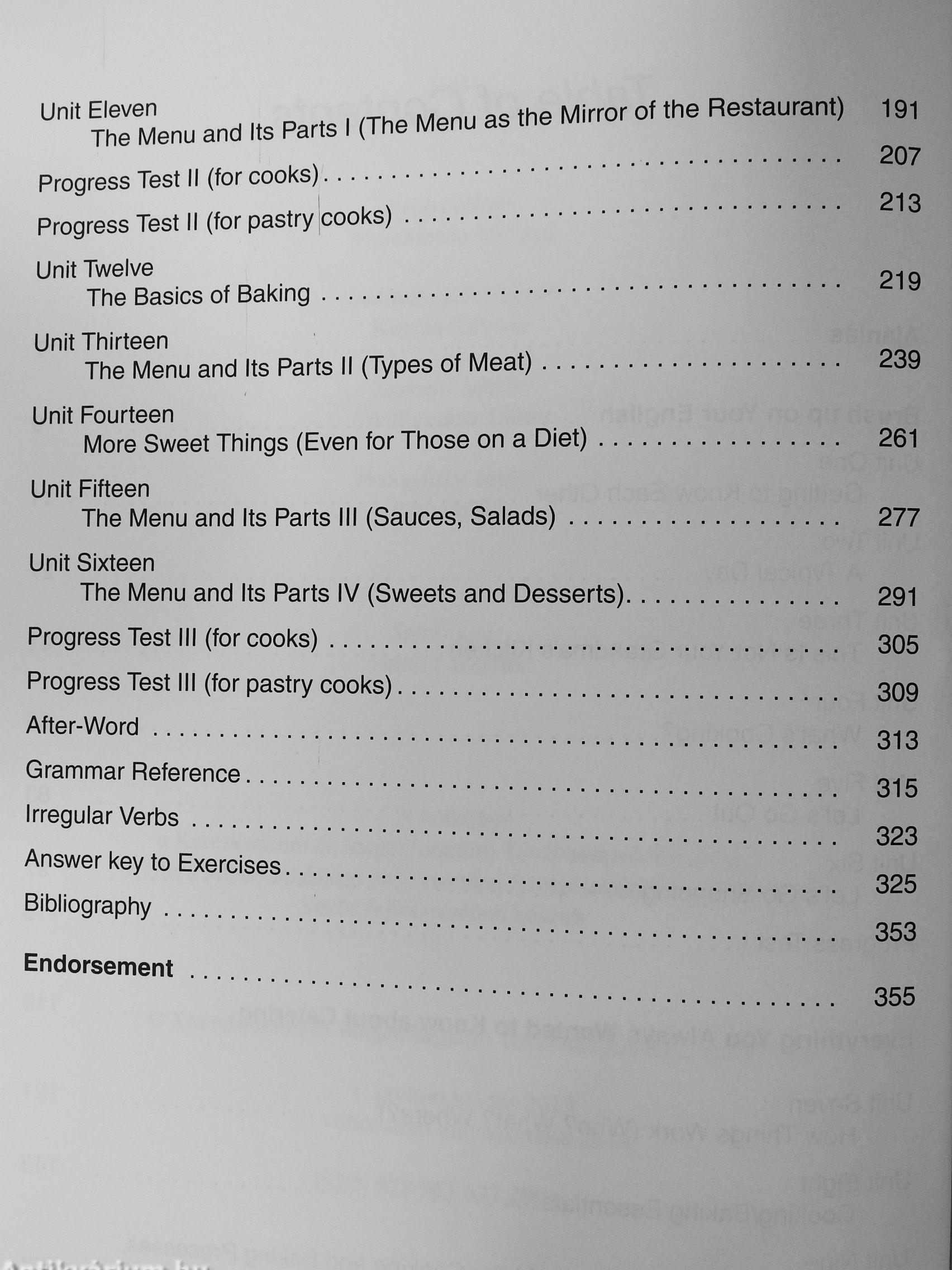 B leendő szakácsok megtalálják az ételkészítés és az étkezés minden fázisára uonatkozó szókincset: mértékegységek, konyhai és euőeszközök, élelmiszerek beszerzése, tárolása, ételek kiszolgálása, uacsorák megteruezése, asztalterítés, ualamlnt a uendégekről ualó gondoskodás, B szakképesítéssel rendelkező álláskeresők számára jelentkezési űrlap, önéletrajzok, állásinterjú-minta is található, amely kiegészíti elméleti felkészültségüket és elindítja őket a uáíasztott szakmai pályán,