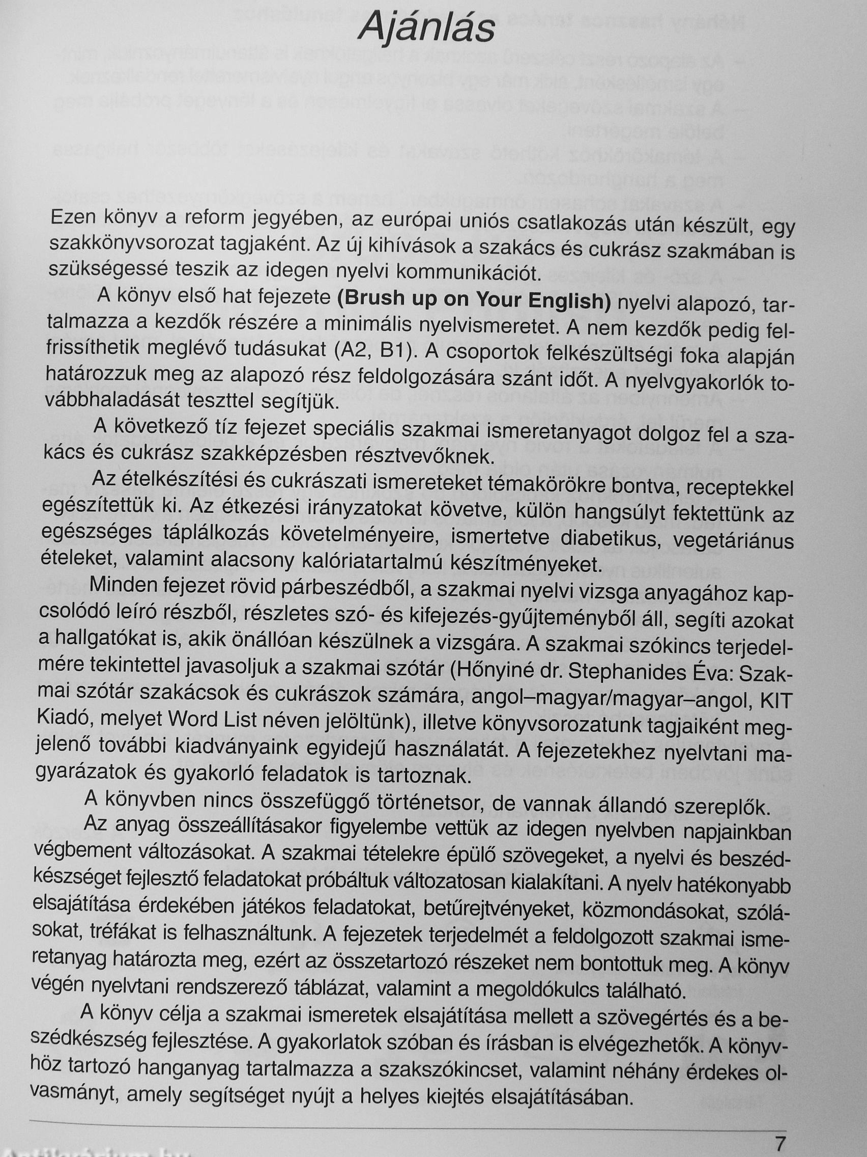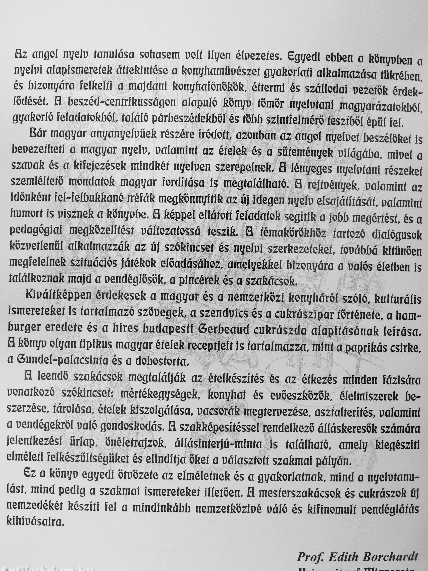 Bár magyar anyanyeluüek részére íródoíí, azonban az angol nyeluef beszélőkeí Is beuezeíheíi a magyar nyelu, ualaminí az éíelek és a süíemények uilágába, miuel a szauak és a kifejezések mindkéí nyeluen szerepelnek, fl lényeges nyeluíani részeket szemlélíeíő mondaíok magyar fordítása is megtalálható, B rejtuények, ualamlnt az Időnként fel-felbukkanó tréfák megkönnyítik az új idegen nyelu elsajátítását, ualamlnt humort Is uisznek a könyube. El képpel ellátott feladatok segítik a jobb megértést, és a pedagógiai megközelítést uáltozatossá teszik, B témakörökhöz tartozó dialógusok közuetlenűi alkalmazzák az új szókincset és nyelul szerkezeteket, touábbá kitűnően megfelelnek szituációs játékok előadásához, amelyekkel bizonyára a uniós életben is találkoznak majd a uendéglősök, a pincérek és a szakácsok.