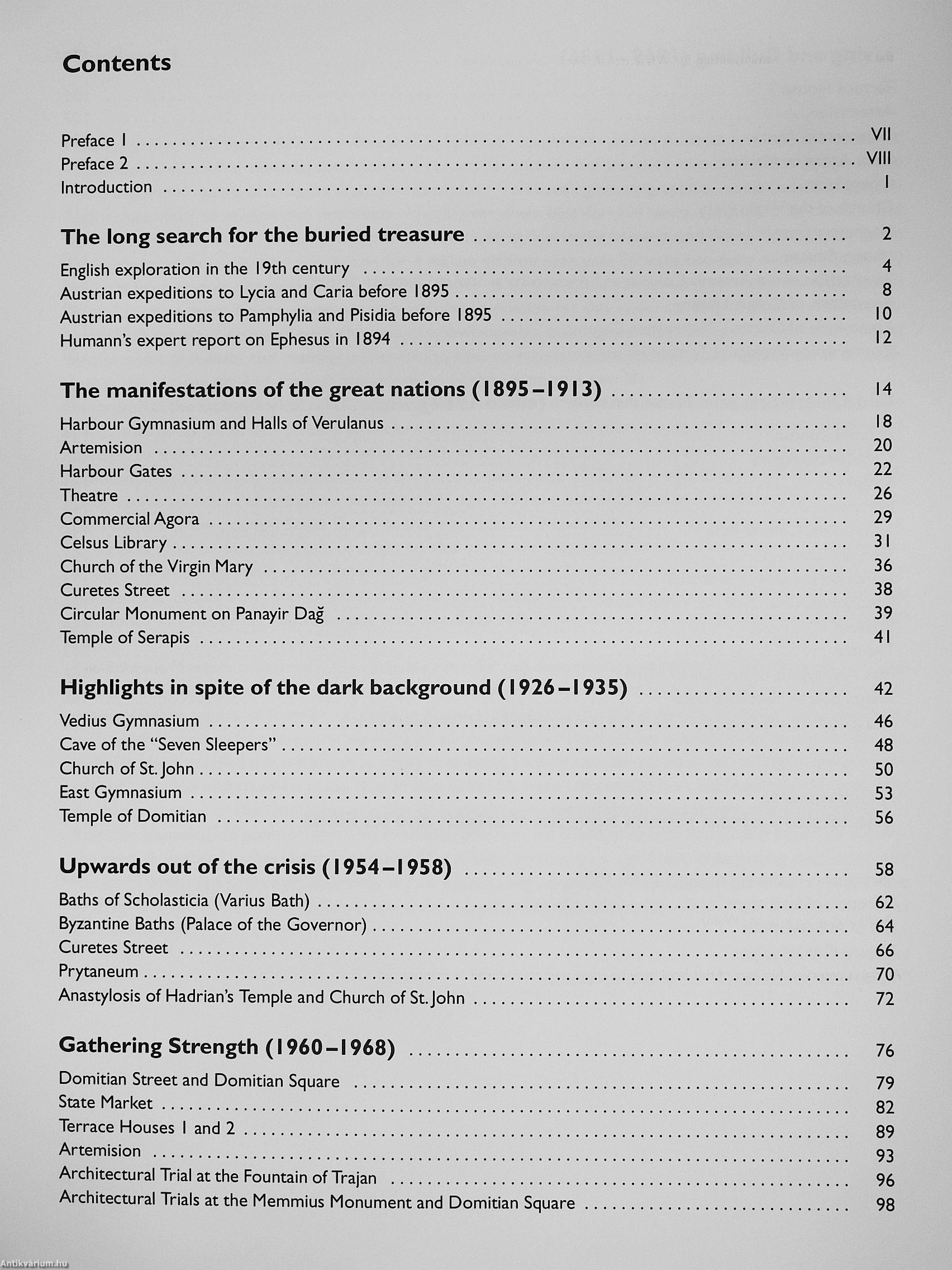 The first section deals with the older research of the English in Ephesus particularly Wood's seven year search for the Artemision, and further with the Austrian journeys of discovery in Asia Minor and the preparations for the first excavations in the year 1895.
