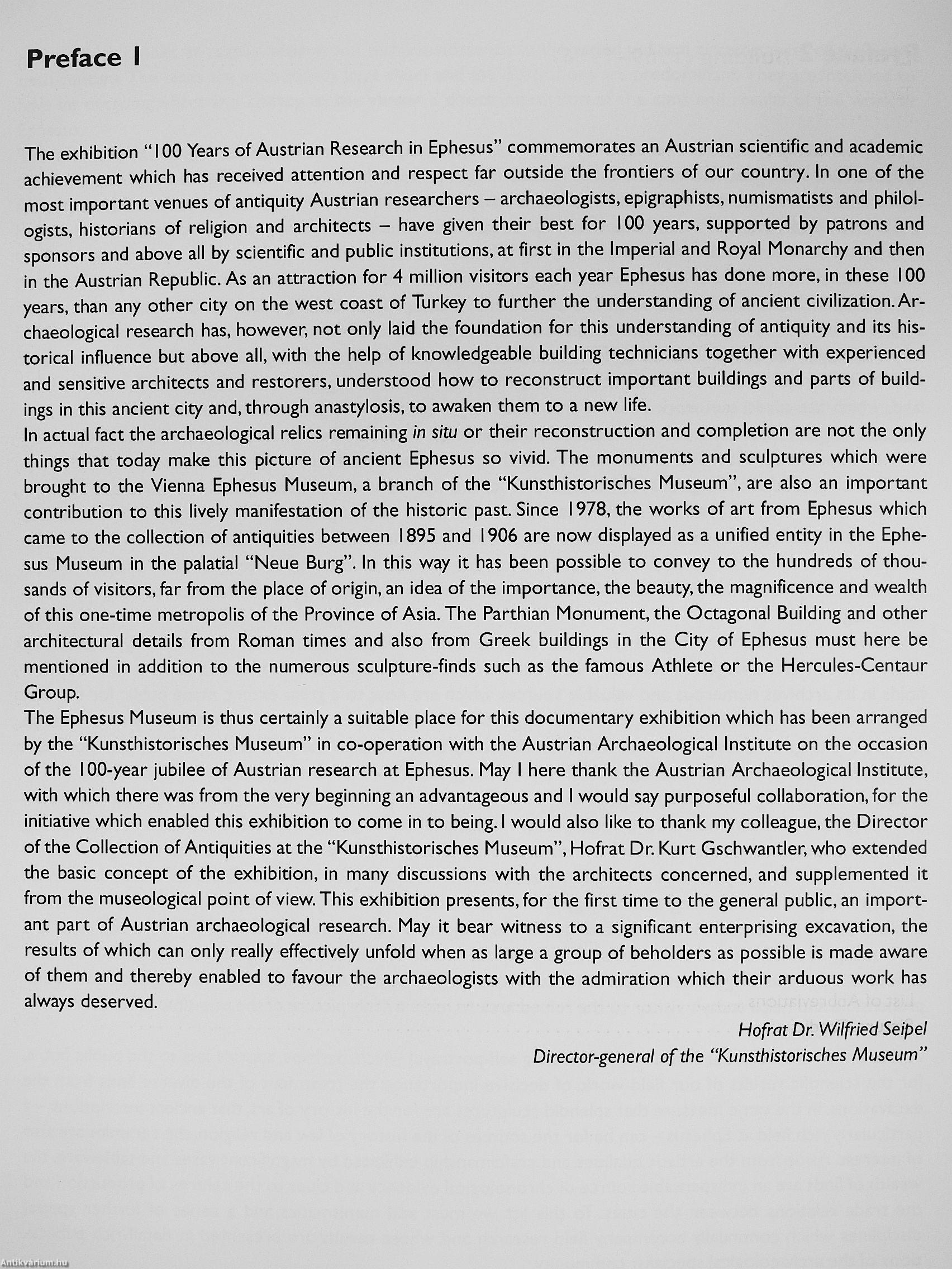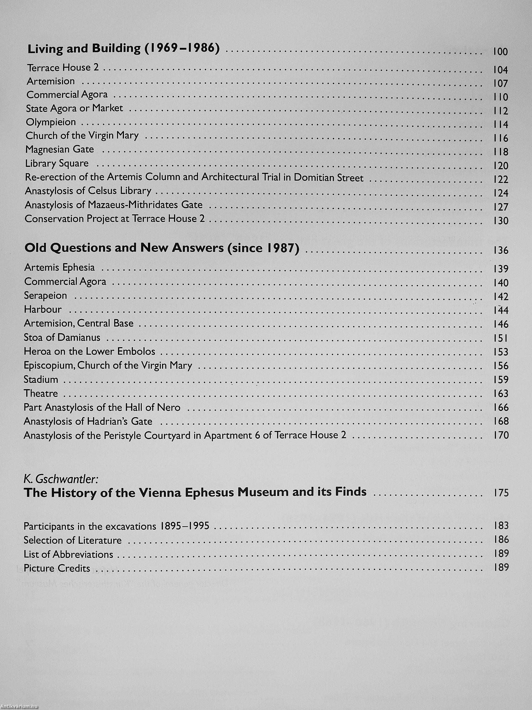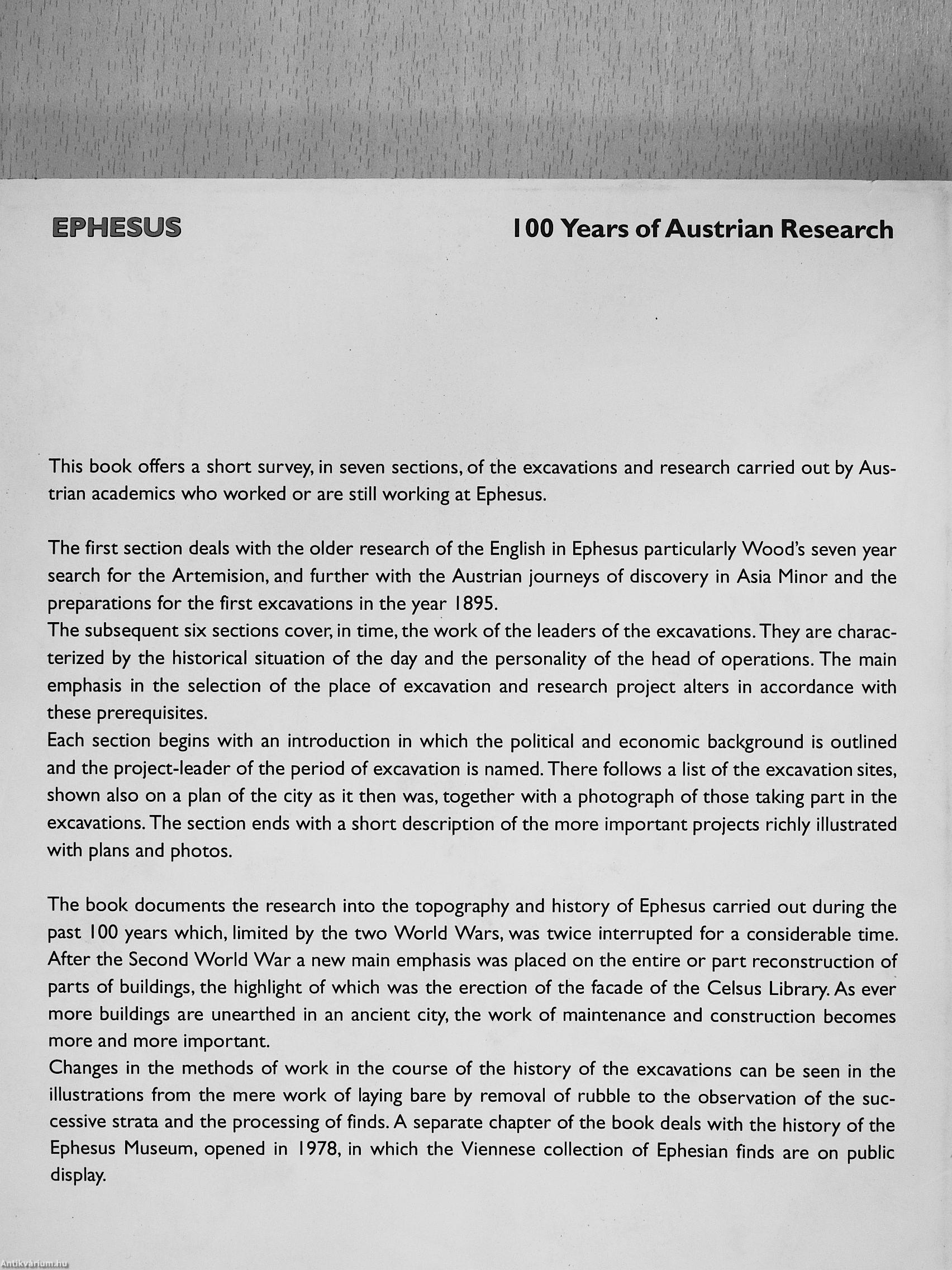 The book documents the research into the topography and history of Ephesus carried out during the past 100 years which, limited by the two World Wars, was twice Interrupted for a considerable time. After the Second World War a new main emphasis was placed on the entire or part reconstruction of parts of buildings, the highlight of which was the erection of the facade of the Celsus Library. As ever more buildings are unearthed in an ancient city, the work of maintenance and construction becomes more and more important.