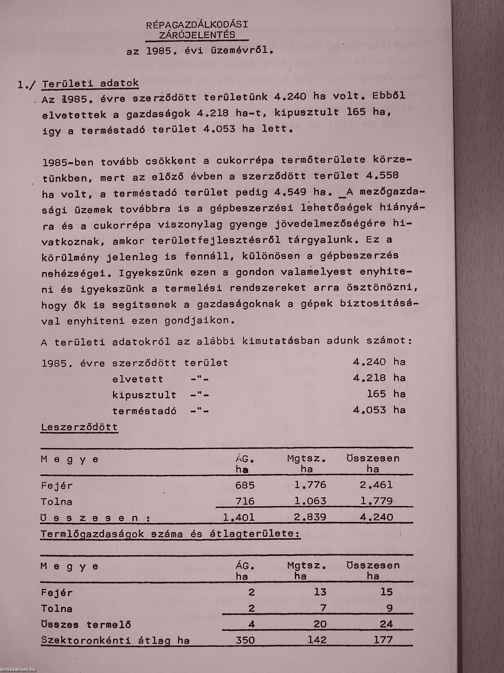 Ercsi Cukorgyár összefoglaló jelentése az 1985. évi üzemről