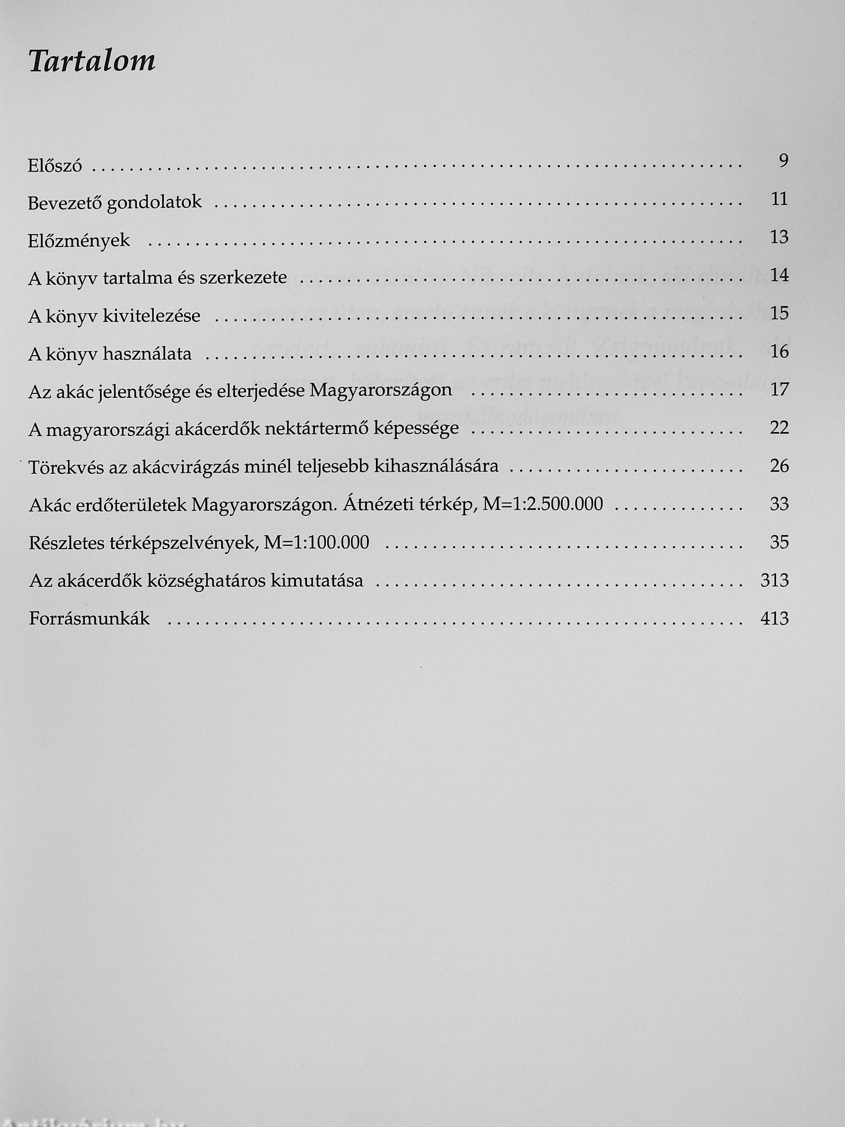 Jelen kiadvány az akácerdőkre vonatkozó megfigyeléseinek esszenciája, mely az ország egészére nézve, településekre bontva ismerteti az akác előfordulását és virágzási idejét. A könyvben térképek ábrázolják az akácerdők adott településhatáron belüli elhelyezkedését, praktikus segítséget nyújtva terepi megközelítésükhöz is.