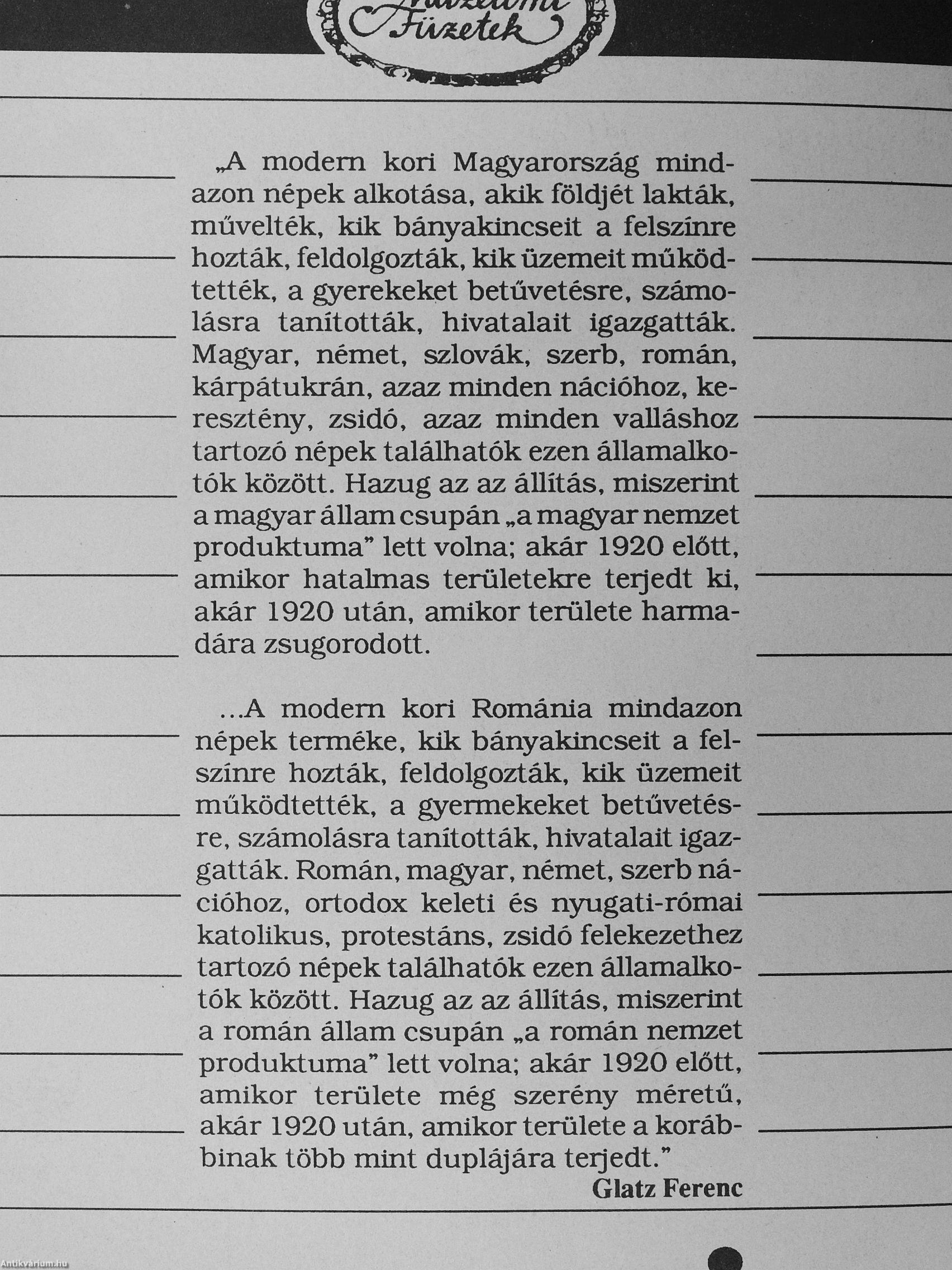 A modem kori Románia mindazon népek terméke, kik bányakincseit a felszínre hozták, feldolgozták, kik üzemeit működtették, a gyermekeket betűvetésre, számolásra tanították, hivatalait igazgatták. Román, magyar, német, szerb nációhoz, ortodox keleti és nyugati-római katolikus, protestáns, zsidó felekezethez tartozó népek találhatók ezen államalkotók között. Hazug az az állítás, miszerint a román állam csupán „a román nemzet produktuma" lett volna; akár 1920 előtt, amikor területe még szerény méretű, . akár 1920 után, amikor területe a korábbinak több mint duplájára terjedt."
