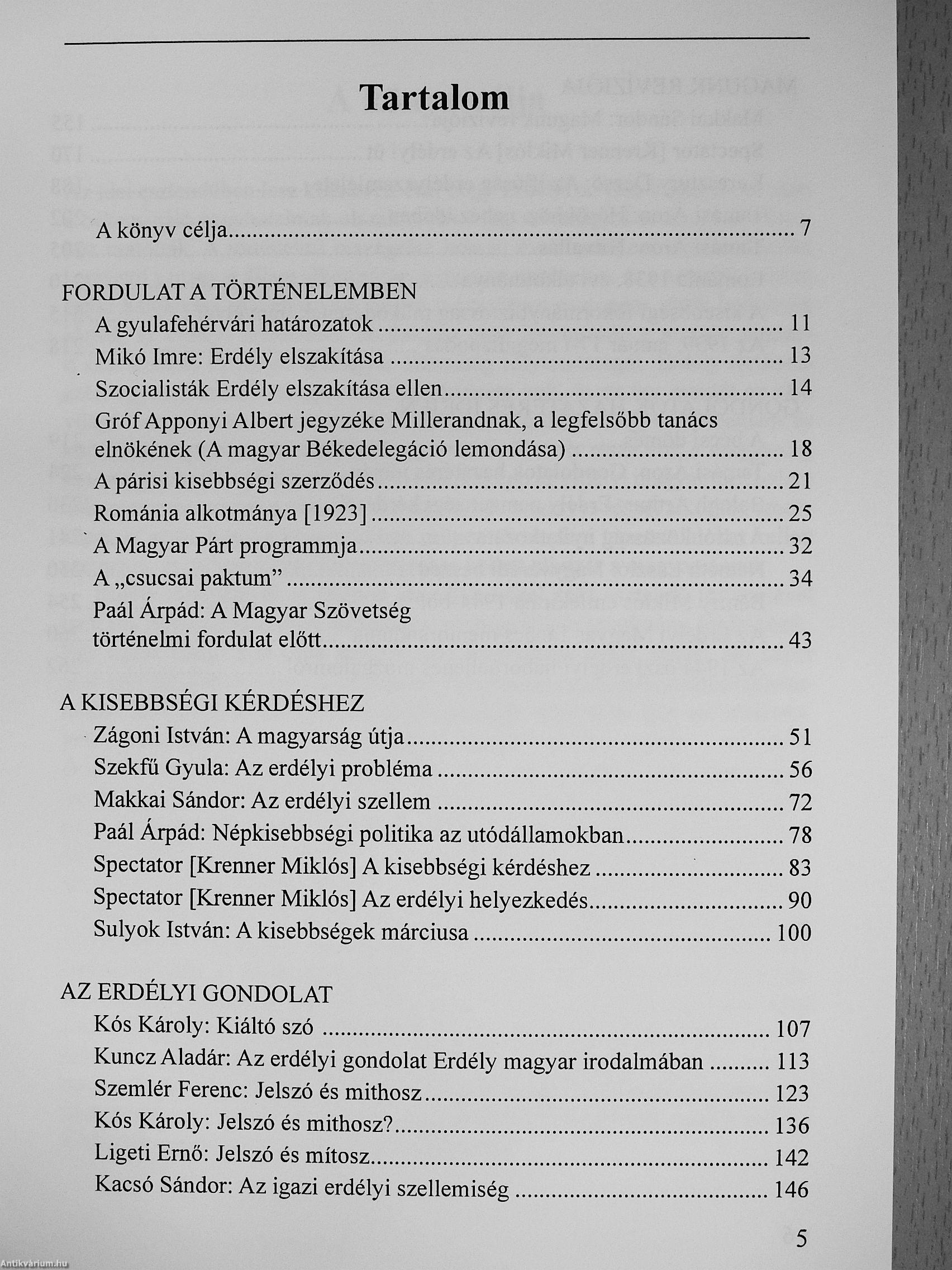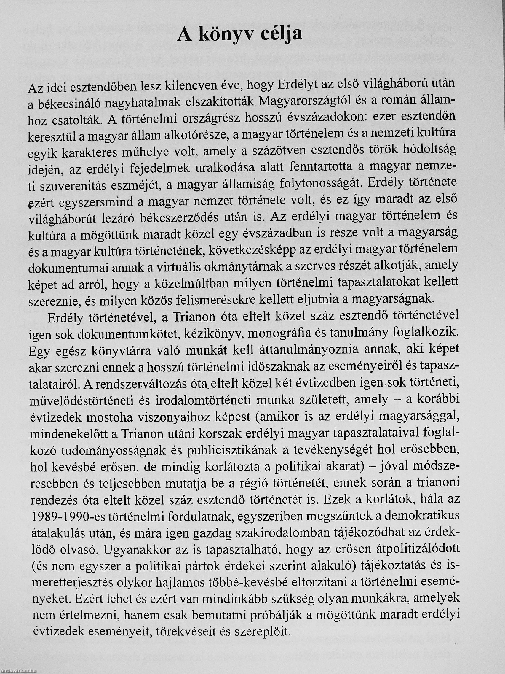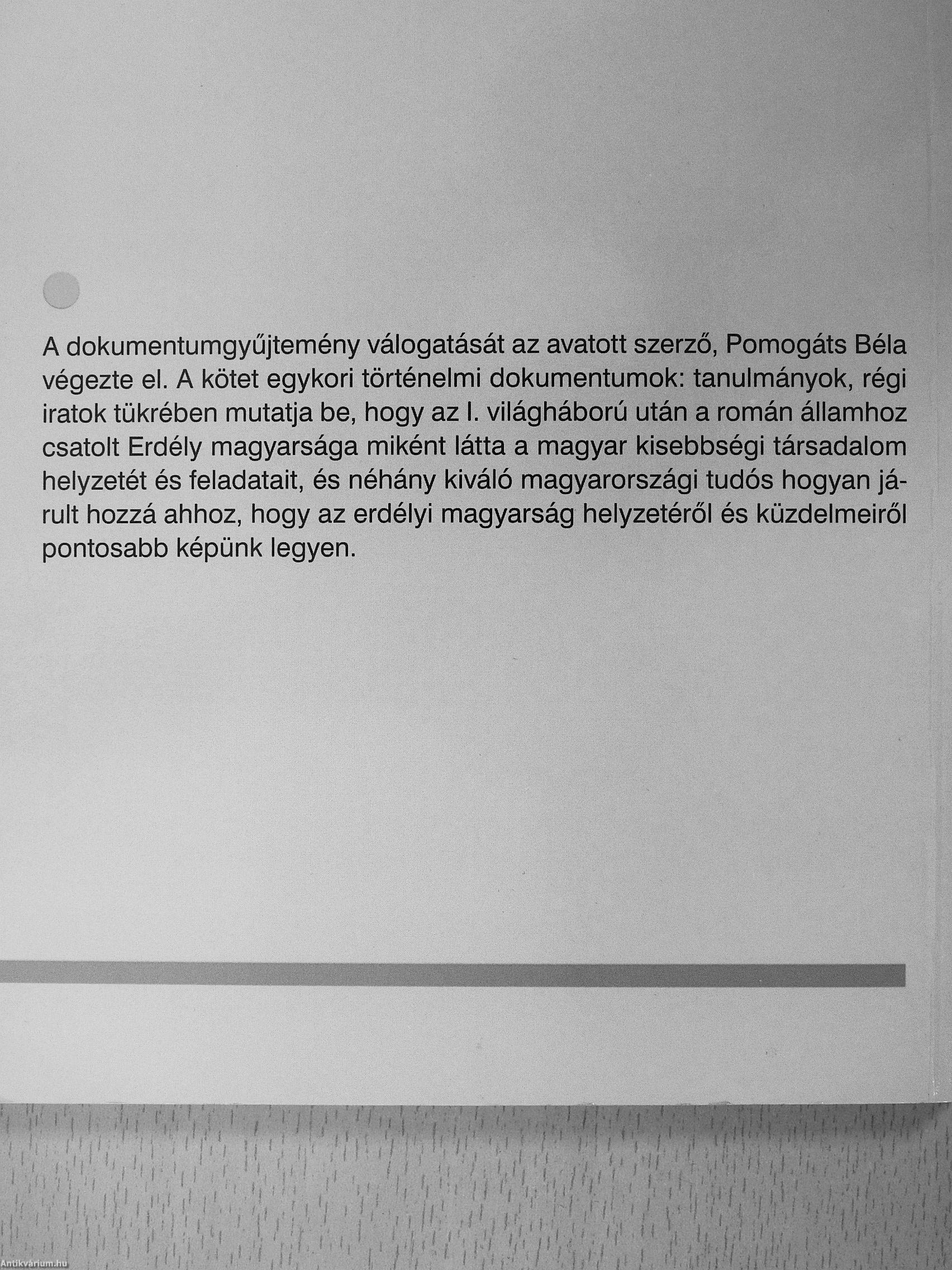 A dokumentumgyűjtemény válogatását az avatott szerző, Pomogáts Béla végezte el. A kötet egykori történelmi dokumentumok: tanulmányok, régi iratok tükrében mutatja be, hogy az I. világháború után a román államhoz csatolt Erdély magyarsága miként látta a magyar kisebbségi társadalom helyzetét és feladatait, és néhány kiváló magyarországi tudós hogyan járult hozzá ahhoz, hogy az erdélyi magyarság helyzetéről és küzdelmeiről pontosabb képünk legyen.