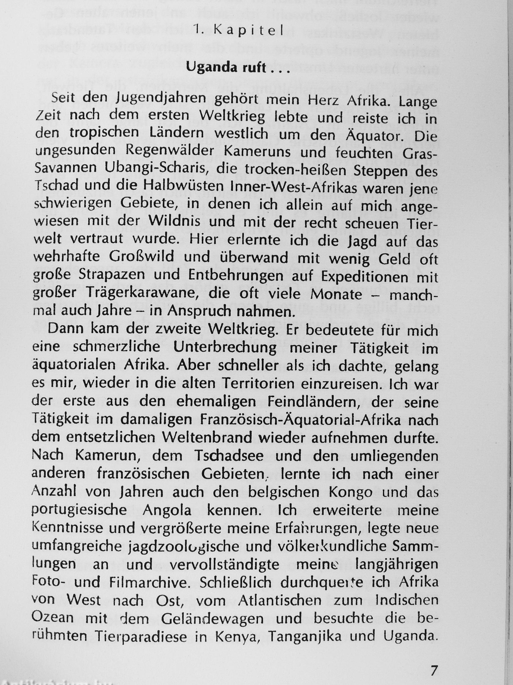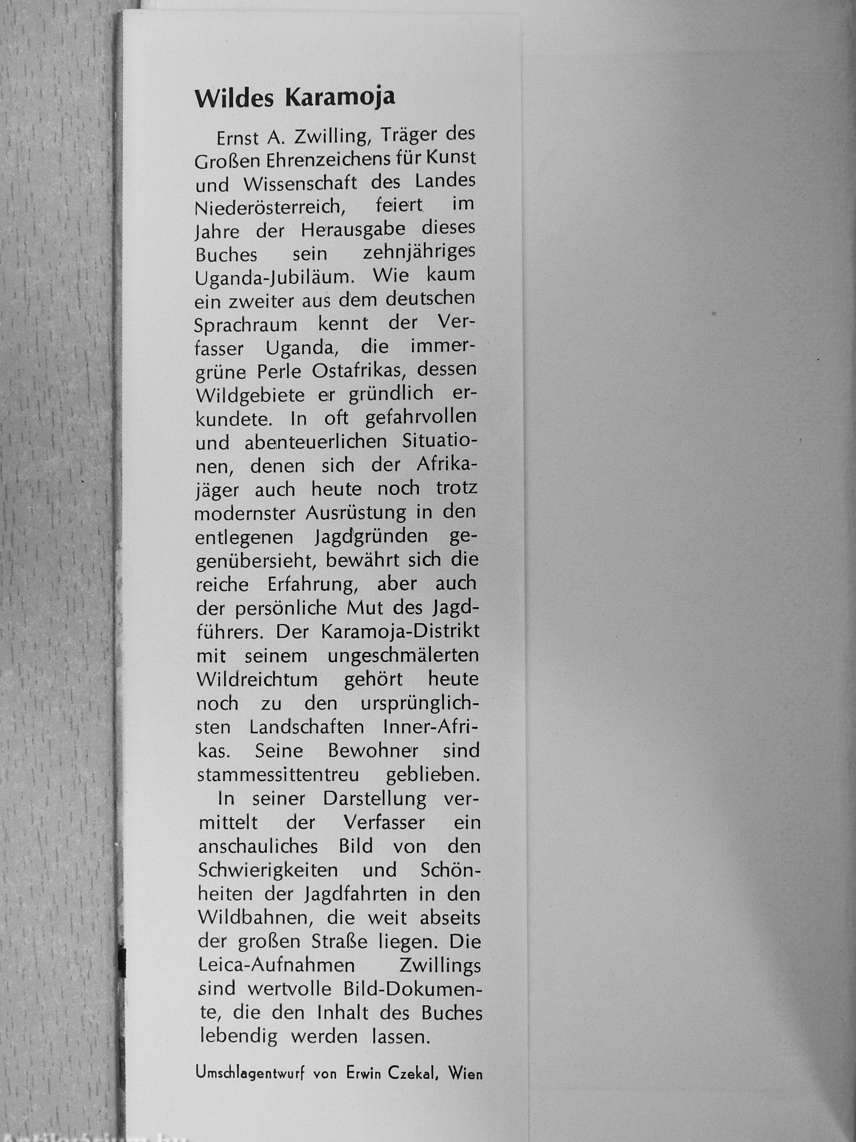 Ernst A, Zwilling, Träger des Großen Ehrenzeichens für Kunst und Wissenschaft des Landes Niederösterreich, feiert im Jahre der Herausgabe dieses Buches sein zehnjähriges Uganda-Jubiläum. Wie kaum ein zweiter aus dem deutschen Sprachraum kennt der Verfasser Uganda, die immergrüne Perle Ostafrikas, dessen Wildgebiete er gründlich erkundete. In oft gefahrvollen und abenteuerlichen Situationen, denen sich der Afrikajäger auch heute noch trotz modernster Ausrüstung in den entlegenen Jagdgründen gegenübersieht, bewährt sich die reiche Erfahrung, aber auch der persönliche Mut des Jagdführers. Der Karamoja-Distrikt mit seinem ungeschmälerten Wildreichtum gehört heute noch zu den ursprünglichsten Landschaften Inner-Afri-kas. Seine Bewohner sind stammessittentreu geblieben.