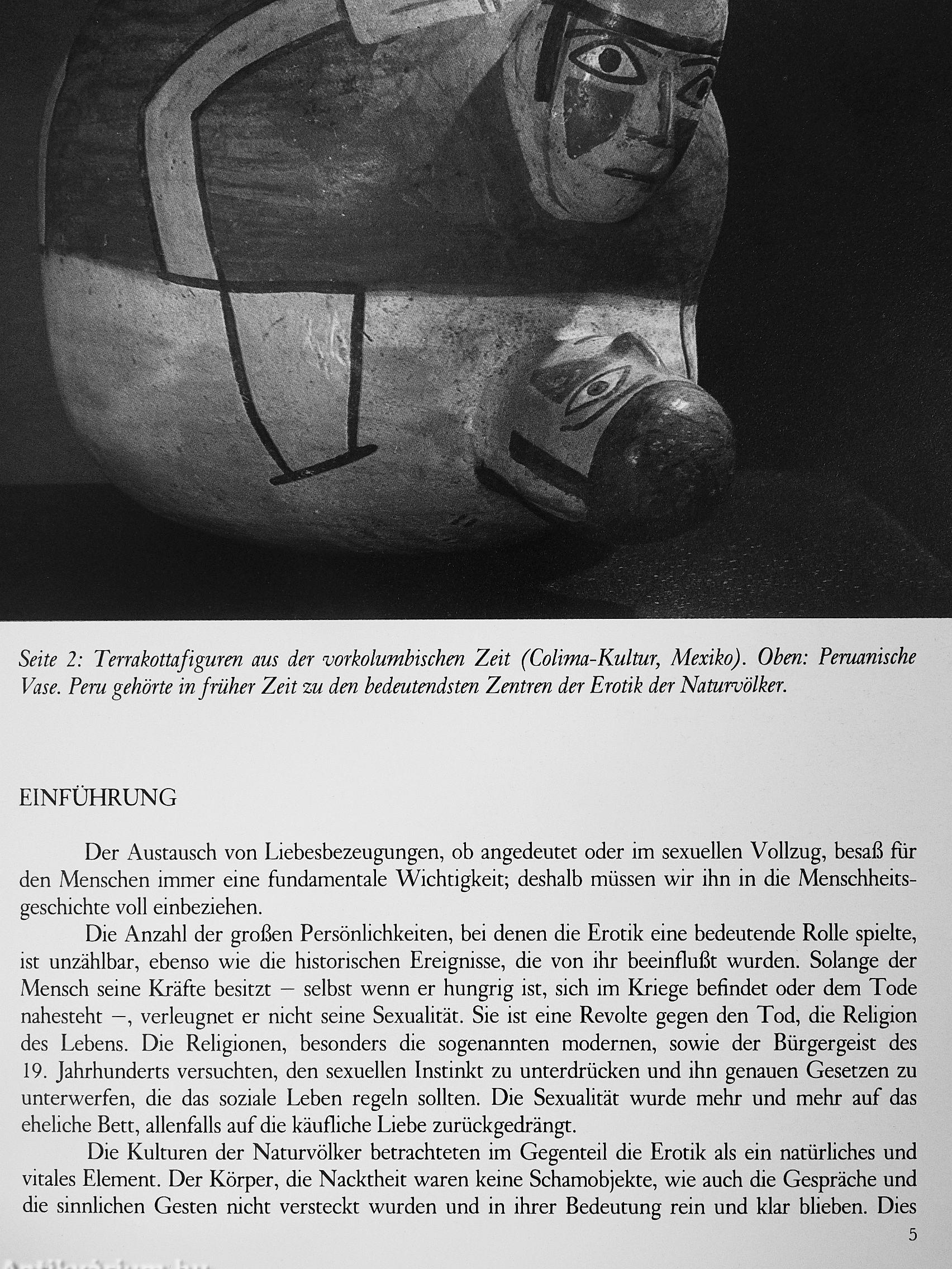 Die beiden Geschlechter hatten bei den Naturvölkern nie die Eigenarten, die ihnen in der abendländischen Kultur zugeschrieben wurden: Entscheidungskraft und physische Kraft beim Mann sowie Sanftheit und materielles Trachten bei der Frau. Jedes Volk besaß eine ihm eigene Sozialstruktur. So wissen wir, daß in einigen Stämmen die Frauen besitzergreifend, wenig anhänglich und fast gewalttätig den Männern gegenüber waren. T)eren wesentliche Qualitäten bestanden wiederum in der Schwäche und der Unterwerfung. Bei den meisten Naturvölkern wurde der Mensch schon in seiner frühesten Kindheit in die Sexualität eingeführt, einige empfanden das sehr starke Bedürfnis, ihr sexuelles Verlangen zu verewigen, während andere dagegen nicht einmal den erotischen Kuß kannten.
