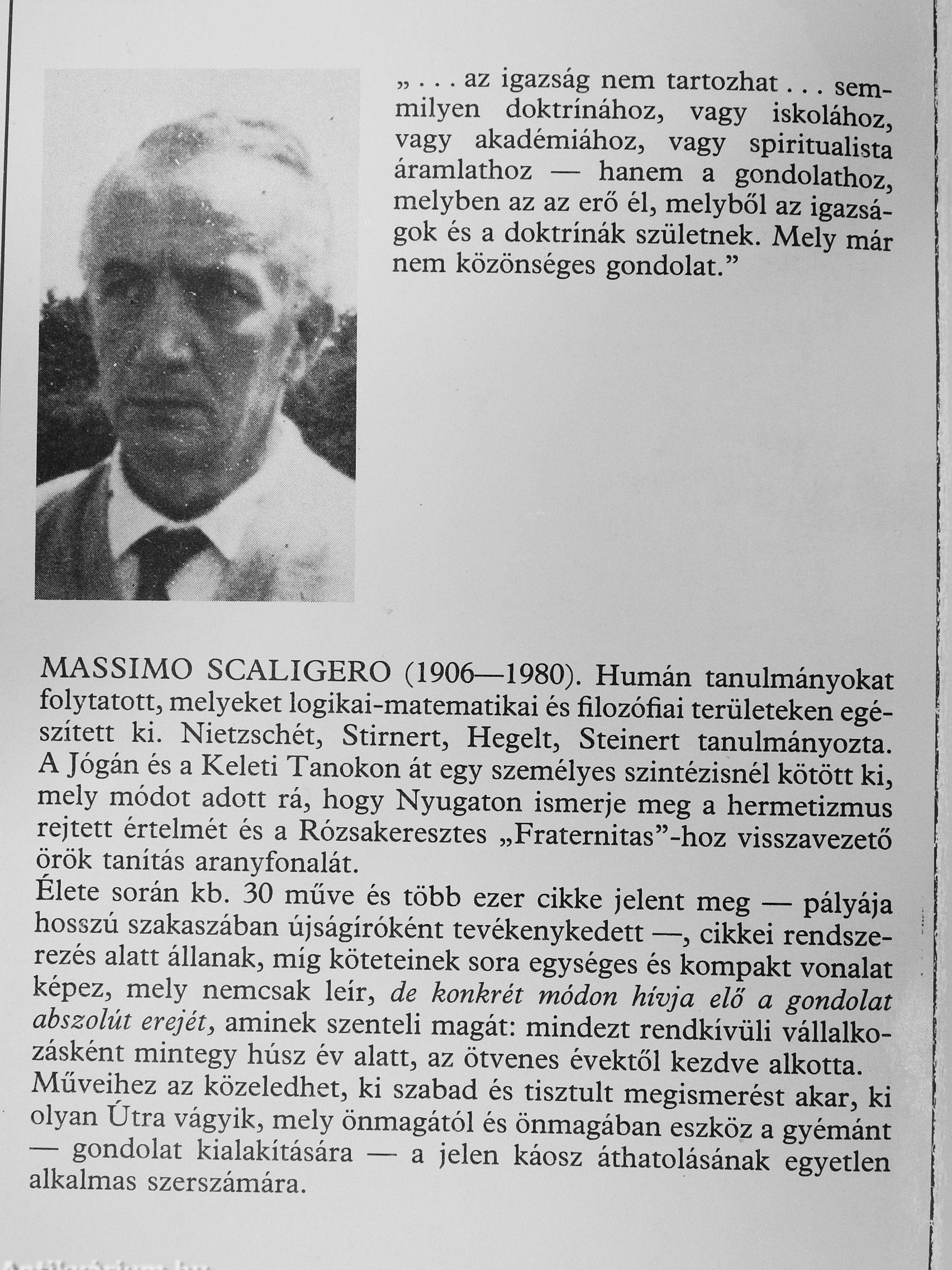 MASSIMO SCALIGERO (1906—1980). Humán tanulmányokat folytatott, melyeket logikai-matematikai és filozófiai területeken egészített ki. Nietzschét, Stirnert, Hegelt, Steinert tanulmányozta. A Jógán és a Keleti Tanokon át egy személyes szintézisnél kötött ki, mely módot adott rá, hogy Nyugaton ismerje meg a hermetizmus rejtett értelmét és a Rózsakeresztes „Fraternítas"-hoz visszavezető örök tanítás aranyfonalát.