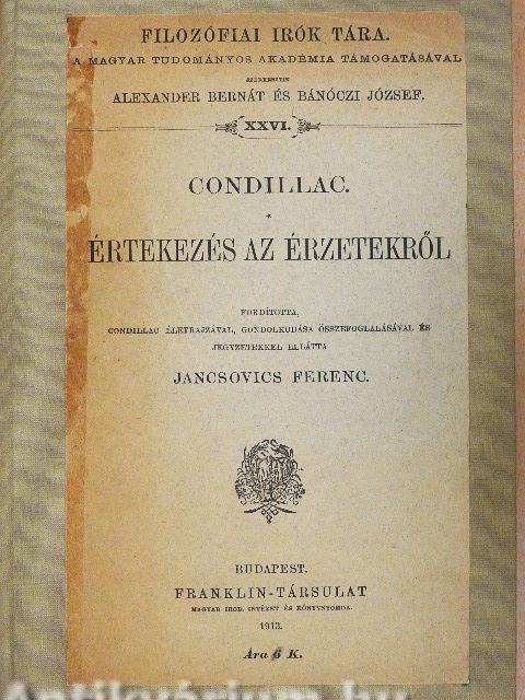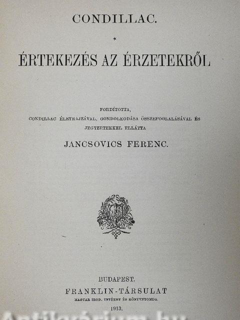 Az érzetekről szóló értekezés pedig főmunkája Condillacnak, amelynek legnagyobb hatása volt a maga idején s amelyet ma is legtöbbet olvasnak és idéznek. Ennyi elegendő volna igazolásul. De legjobban önmaga igazolja magát a könyv.