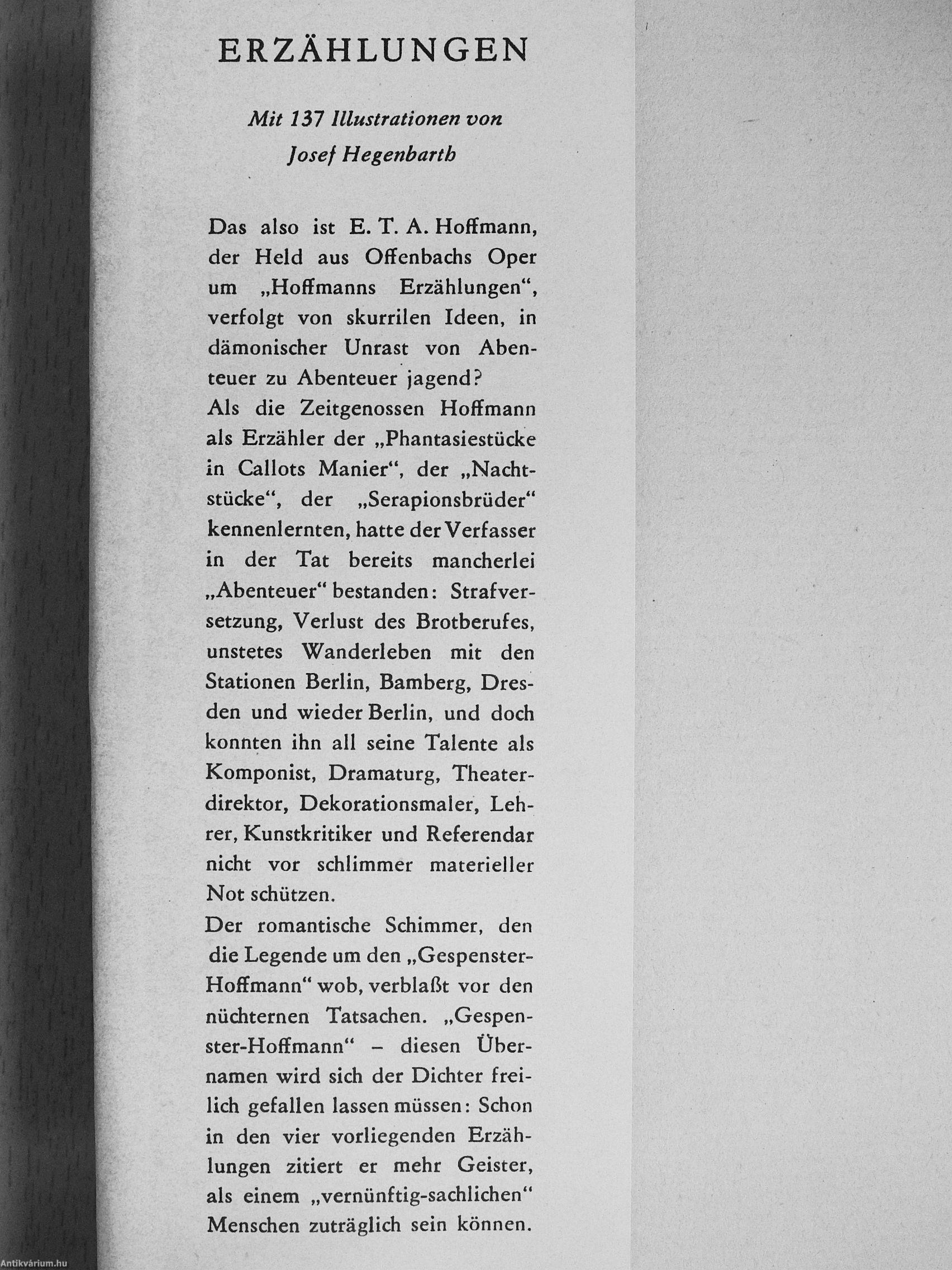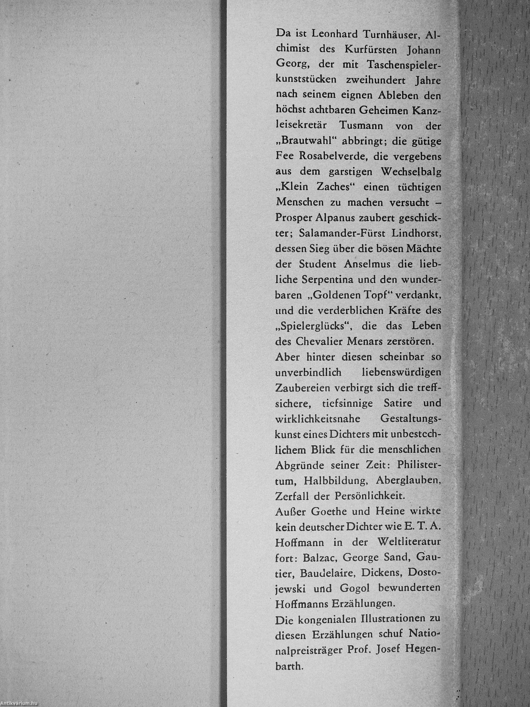 Da ist Leonhard Turnhäuser, Alchimist des Kurfürsten Johann Georg, der mit Taschenspielerkunststücken zweihundert Jahre nach seinem eignen Ableben den höchst achtbaren Geheimen Kanzleisekretär Tusmann von der „Brautwahl" abbringt; die gütige Fee Rosabelverde, die vergebens aus dem garstigen Wechselbalg „Klein Zaches" einen tüchtigen Menschen zu machen versucht -Prosper Alpanus zaubert geschickter; Salamander-Fürst Lindhorst, dessen Sieg über die bösen Mächte der Student Anseimus die liebliche Setpentina und den wunderbaren „Goldenen Topf" verdankt, und die verderblichen Kräfte des „Spielerglücks", die das Leben des Chevalier Menars zerstören. Aber hinter diesen scheinbar so unverbindlich liebenswürdigen Zaubereien verbirgt sich die treffsichere, tiefsinnige Satire und wirklichkeitsnahe Gestaltungskunst eines Dichters mit unbestechlichem Blick für die menschlichen Abgründe seiner Zeit: Philistertum, Halbbildung, Aberglauben, Zerfall der Persönlichkeit. Außer Goethe und Heine wirkte kein deutscher Dichter wie E. T. A. Hoffmann in der Weltliteratur fort: Balzac, George Sand, Gautier, Baudelaire, Dickens, Dostojewski und Gogol bewunderten Hoffmanns Erzählungen. Die kongenialen Illustrationen zu diesen Erzählungen schuf Nationalpreisträger Prof. Josef Hegenbarth.