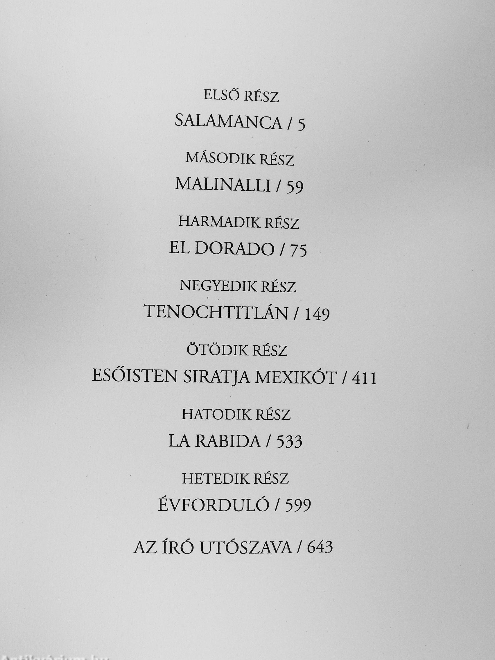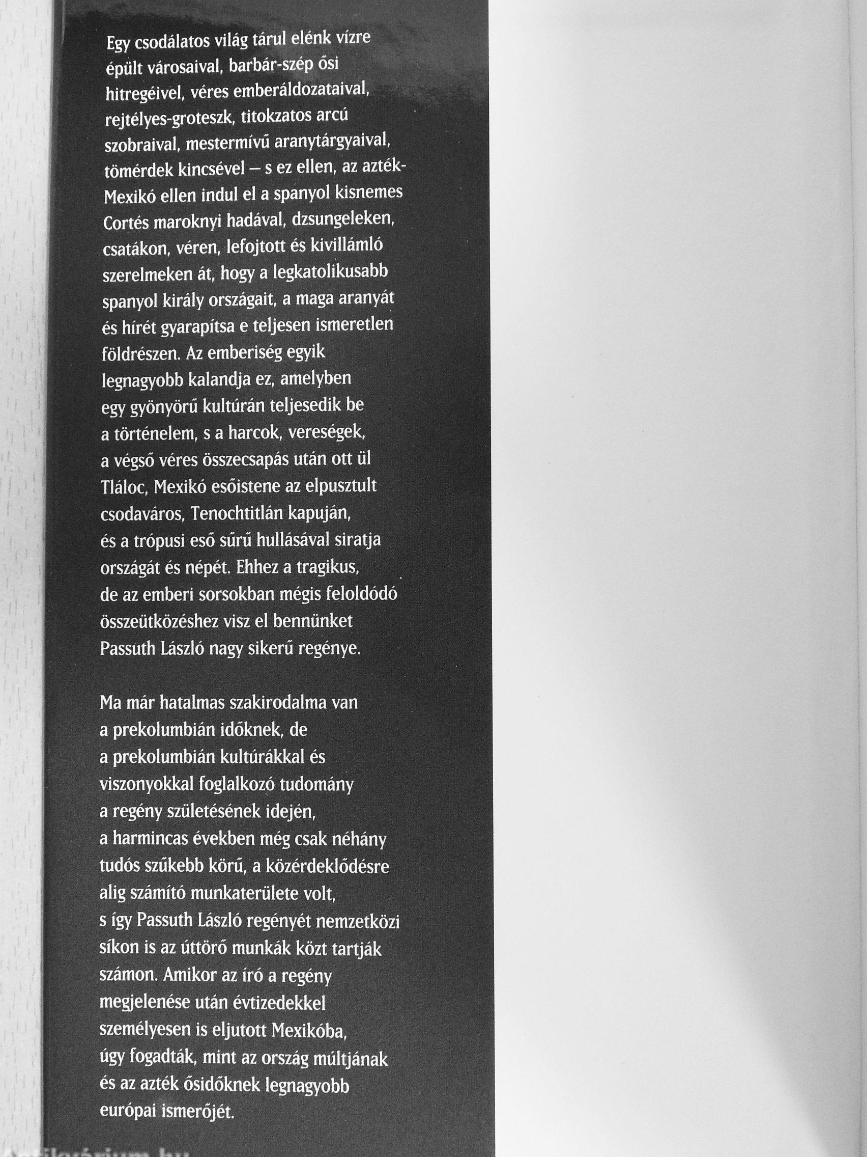Egy csodálatos világ tárul elénk vízre épült városaival, barbár-szép ősi hitregéivel, véres emberáldozataival, rejtélyes-groteszk, titokzatos arcú szobraival, mestermívű aranytárgyaival, tömérdek kincsével - s ez ellen, az azték-Mexikó ellen indul el a spanyol kisnemes Cortés maroknyi hadával, dzsungeleken, csatákon, véren, lefojtott és kivillámló szerelmeken át, hogy a legkatolikusabb spanyol király országait, a maga aranyát és hírét gyarapítsa e teljesen ismeretlen földrészen. Az emberiség egyik legnagyobb kalandja ez, amelyben egy gyönyörű kultúrán teljesedik be a történelem, s a harcok, vereségek, a végső véres összecsapás után ott ül Tláloc, Mexikó esőistene az elpusztult csodaváros, Tenochtitlán kapuján, és a trópusi eső sűrű hullásával siratja országát és népét. Ehhez a tragikus, de az emberi sorsokban mégis feloldódó összeütközéshez visz el bennünket Passuth László nagy sikerű regénye.