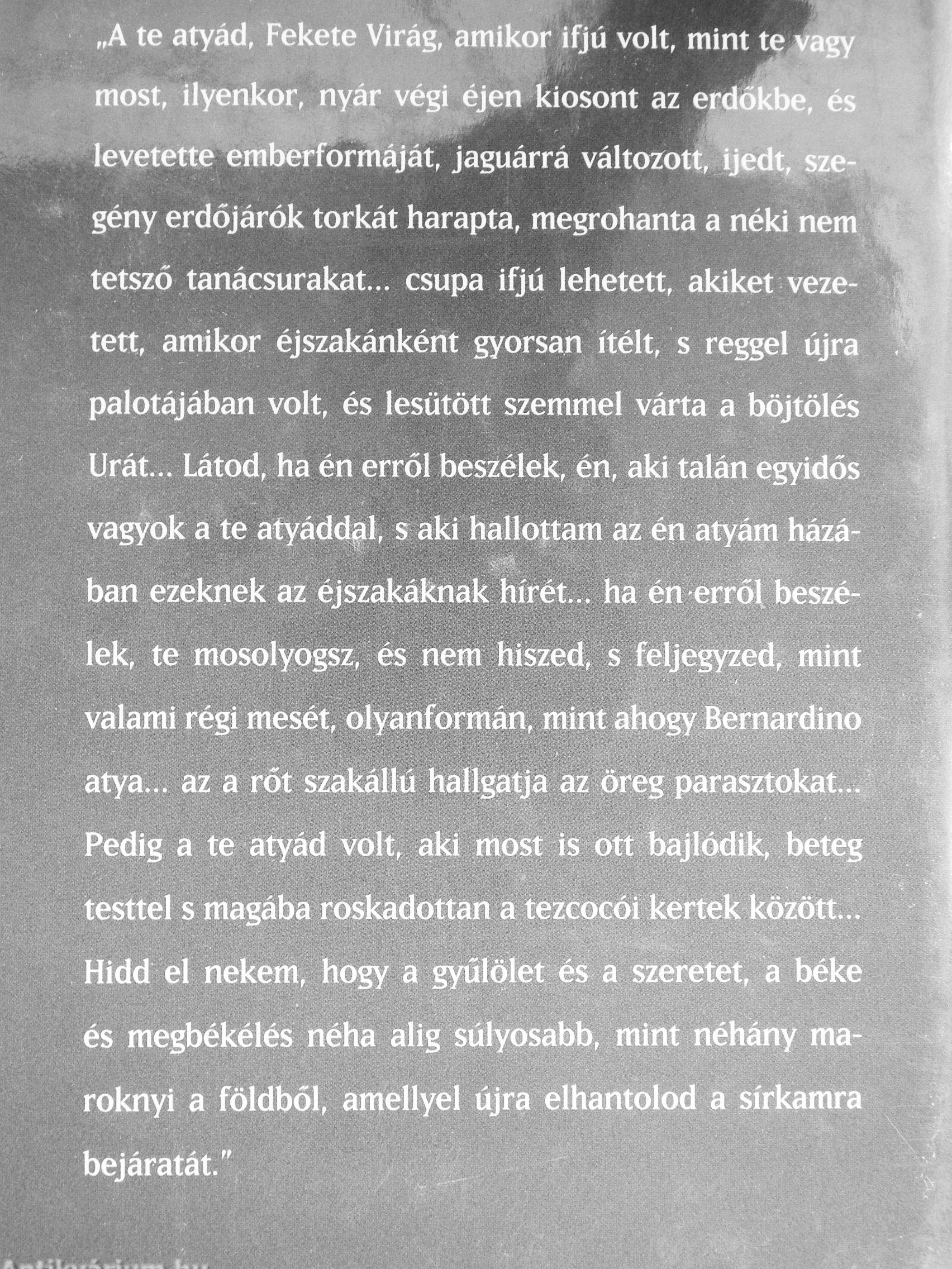 ,A te atyád, Fekete Virág, amikor ifjú volt, mint te vagy most, ilyenkor, nyár végi éjen kiosont az erdőkbe, és levetette emberformáját, jaguárrá változ^ott, ijedt, szegény erdőjárók torkát harapta, megrohanta a néki nem tetsző. tanácsurakat csupa ifjú lehetett, akiket vezetett, amikor éjszakánként gyorsan ítélt, s reggel újra palotájában volt, és lesütött szemmel várta a böjtölés Urát Látod, ha én erről beszélek, én, aki talán egyidős vagyok a te atyáddal, s aki hallo|tam az én atyám házában ezeknek az éjszakáknak hírét ha én erről beszélek, te mosolyogsz, és nem hiszed, s feljegyzed, mint valami régi mesét, olyanformán, mint ahogy Bernardino atya az a rőt szakállú hallgatja az öreg parasztokat ; Pedig a te atyád volt, aki most is ott bajlódik, beteg testtel s magába roskadottan a tezcocói kertek között Hidd el nekem, hogy a gyűlölet és a szeretet, a béke és megbékélés néha alig súlyosabb, mint néhány maroknyi a földből, amellyel újra elhantolod a sírkamra bejáratát."