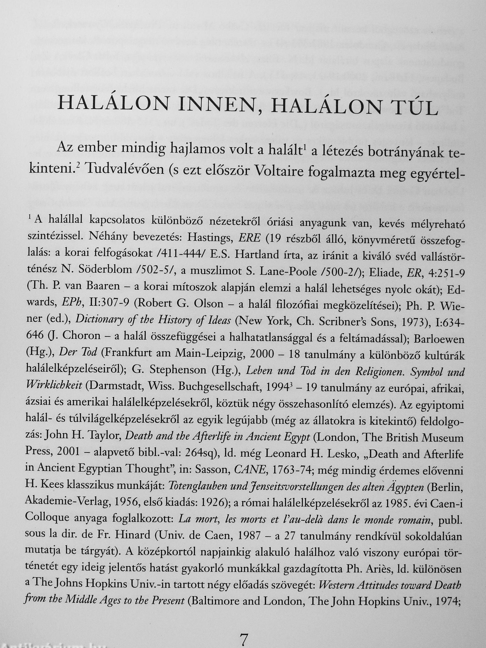 Tudjuk, az élőlények között csak az embernek van haláltudata, amelynek a mitikus, a vallási, és végül, nagyon is prózai megnyilvánulásai az emberi alakulást legalább úgy tagolják és jellemzik, mint a társadalmi lét materiáhsabb, „evilági" mozzanatai. A korai, mitikus időkben a halál „botrányát" még nem hozták őseink kapcsolatba a biológiai folyamatokkal, a felmerülő okok mind külsődlegesek voltak, s a halál még nem volt része az életnek. A bronzkori civilizációktól a középkor végéig tartó hosszú időszakban, az emberiség vallási korszakában fogalmazódnak meg a halálnak s a halottak túlvilági létének nagy toposzai: ritkábban a test, gyakrabban a különböző lélekformák továbbélési esélyei, a kezdeti közös túlvilági árnyékszerű léttől az „axiális kor" egyéni megmérettetéseiig, és a különböző közbenső, a végítéletekre, a pokolra és paradicsomra vonatkozó elképzelések. Elmondható, hogy a túlvilág vallási elképzelései jelentős mértékben hozzájárultak az evilági lét tudományos és filozófiai megismeréséhez is, hiszen ezek során alakultak ki olyan alapvető etikai fogalmak, mint a bűn, bűntudat, lelkiismeret, egyéni feleiősség, egyáltalában, az élet értelméről való gondolkodás. A máig tartó harmadik korszakban a halálhoz való viszony radikálisan megváltozott: a korábbi közösségek megszűnésével e korszak atomizált, „egydimenziós" emberének nincsen ritualizálható viszonya a saját és a inásik ember halálához, ahhoz egyfajta „elfojtással" él, tabuizálja azt, és a maga környezetéből mesterségesen elkülöníti a haldoklót. A halál korunkban ismét megszűnt az élet része lenni. A tanulmány, miután részletesen bemutatja a második korszaknak a túlvilággal kapcsolatos színes és néha igen elgondolkodtató elképzeléseit, alaposan elemzi a mazdaizmus és az iszlám túlvilágképét, majd bemutatja azt az érdekes vitát, ami a múlt század húszas évei után Dante Divina Co>media)inii\!i lehetséges iszlám gyökerei kapcsán zajlott.