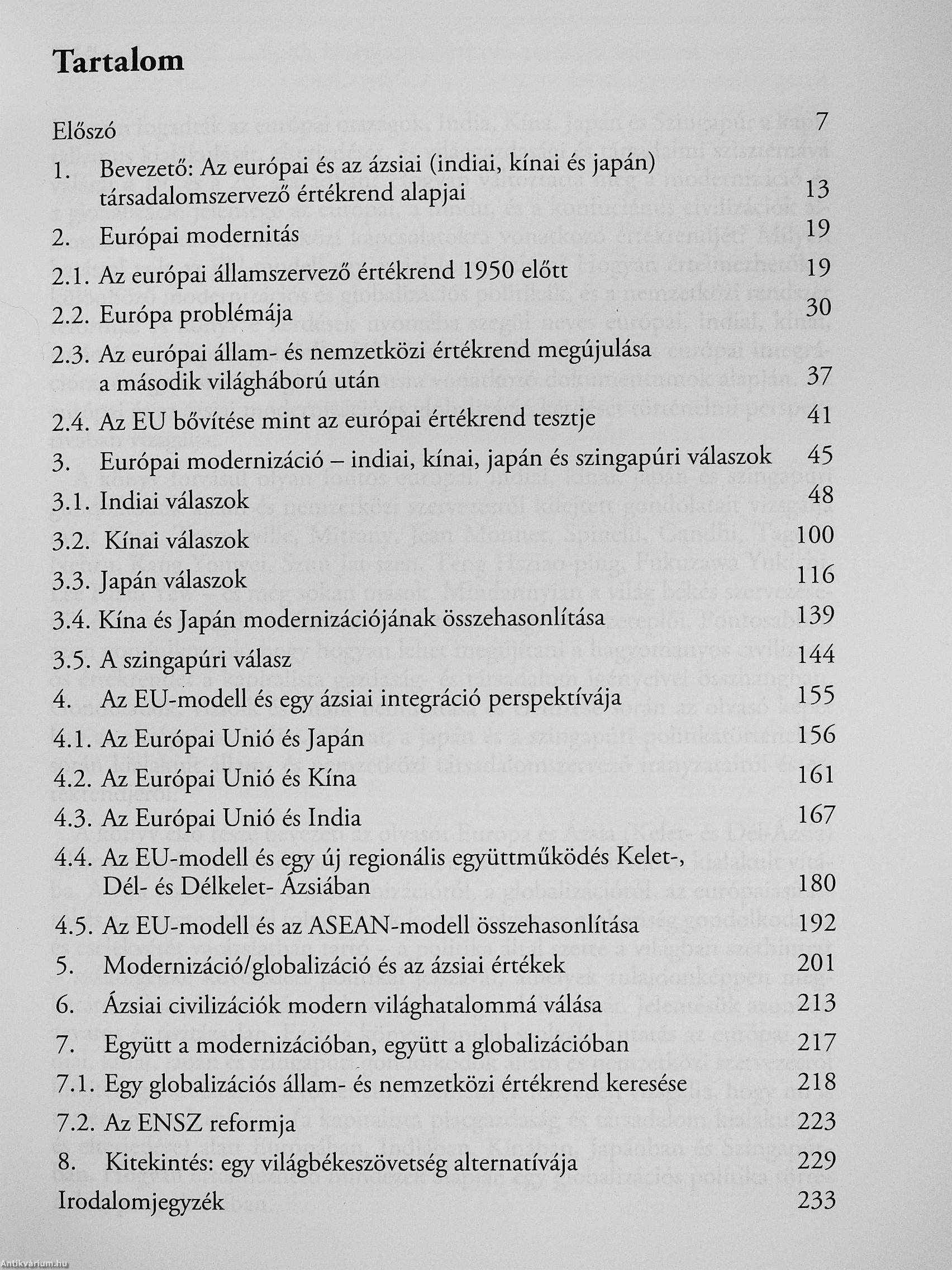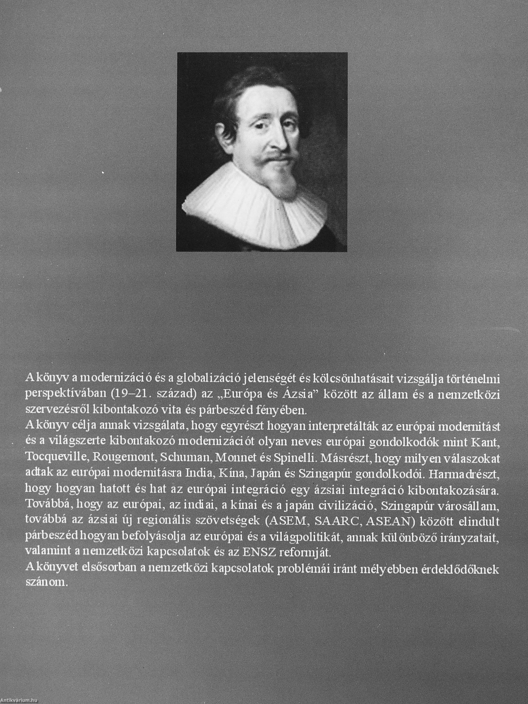 Akönyv célja araiak vizsgálata, hogy egyrészt hogyan inteipretálták az eiu ópai modeniitást és a világszerte kibontakozó inodemizációt olyan neves európai gondolkodók mint Kant, Tocqueville, Rougemont, Schuman, Monnet és Spinelli. Másrészt, hogy milyen válaszokat adtak az európai modemitásra India, Kína, Japán és Szingapíu gondolkodói. Hannadiészt, hogy hogyan hatott és hat az eiu ópai integráció egy ázsiai integjáció kibontakozására. Továbbá, hogy az eiu ópai, az indiai, a kínai és a japán civilizáció, Szingapiir városállam, továbbá az ázsiai új regionális szövetségek (ASEM, SAARC, ASEAN) között elindult párbeszéd hogyan befolyásolja az eiu ópai és a \'ilágpolitikát, annak különböző irányzatait, valamint a nemzetközi kapcsolatok és az ENSZ... Tovább
