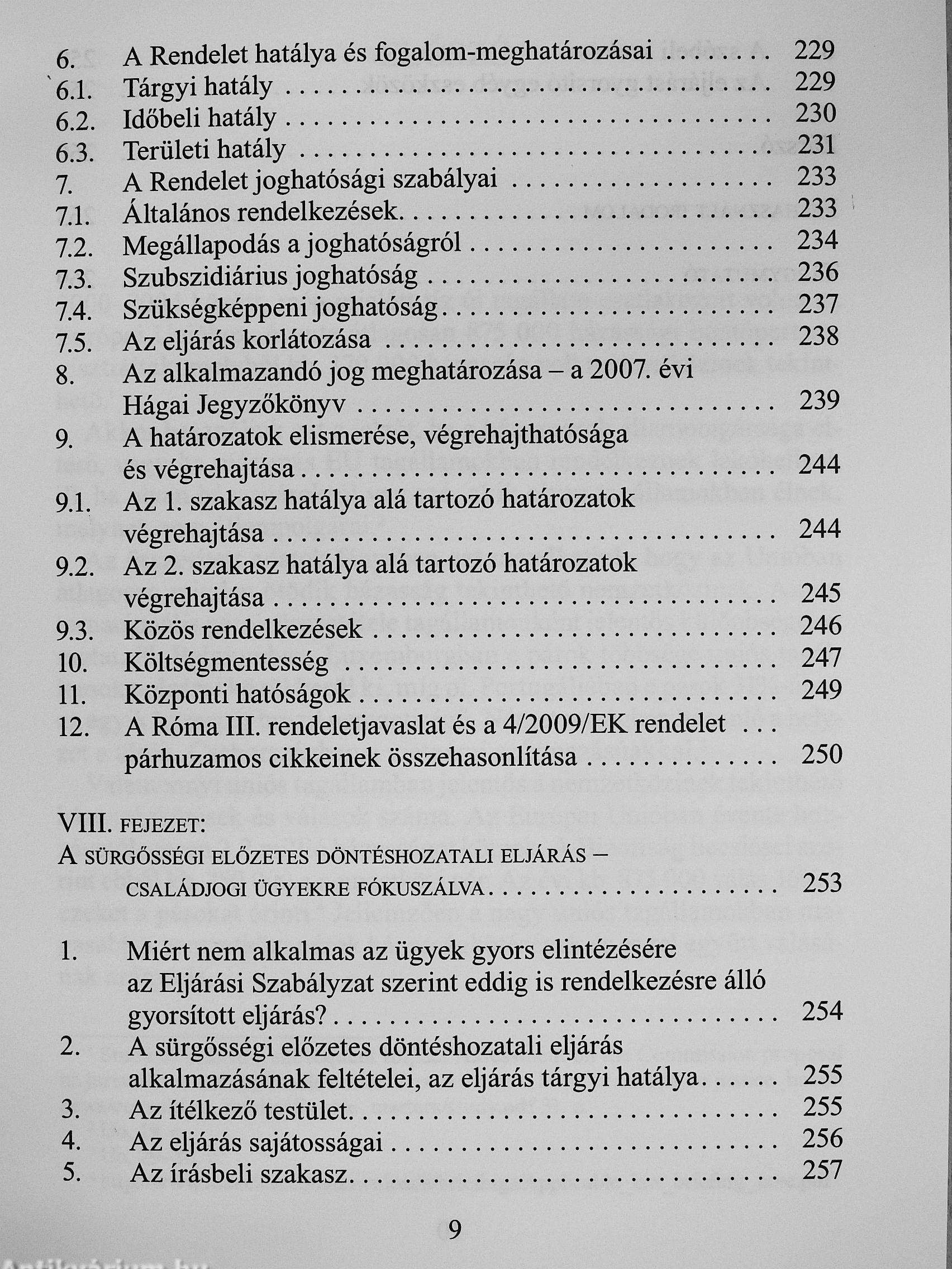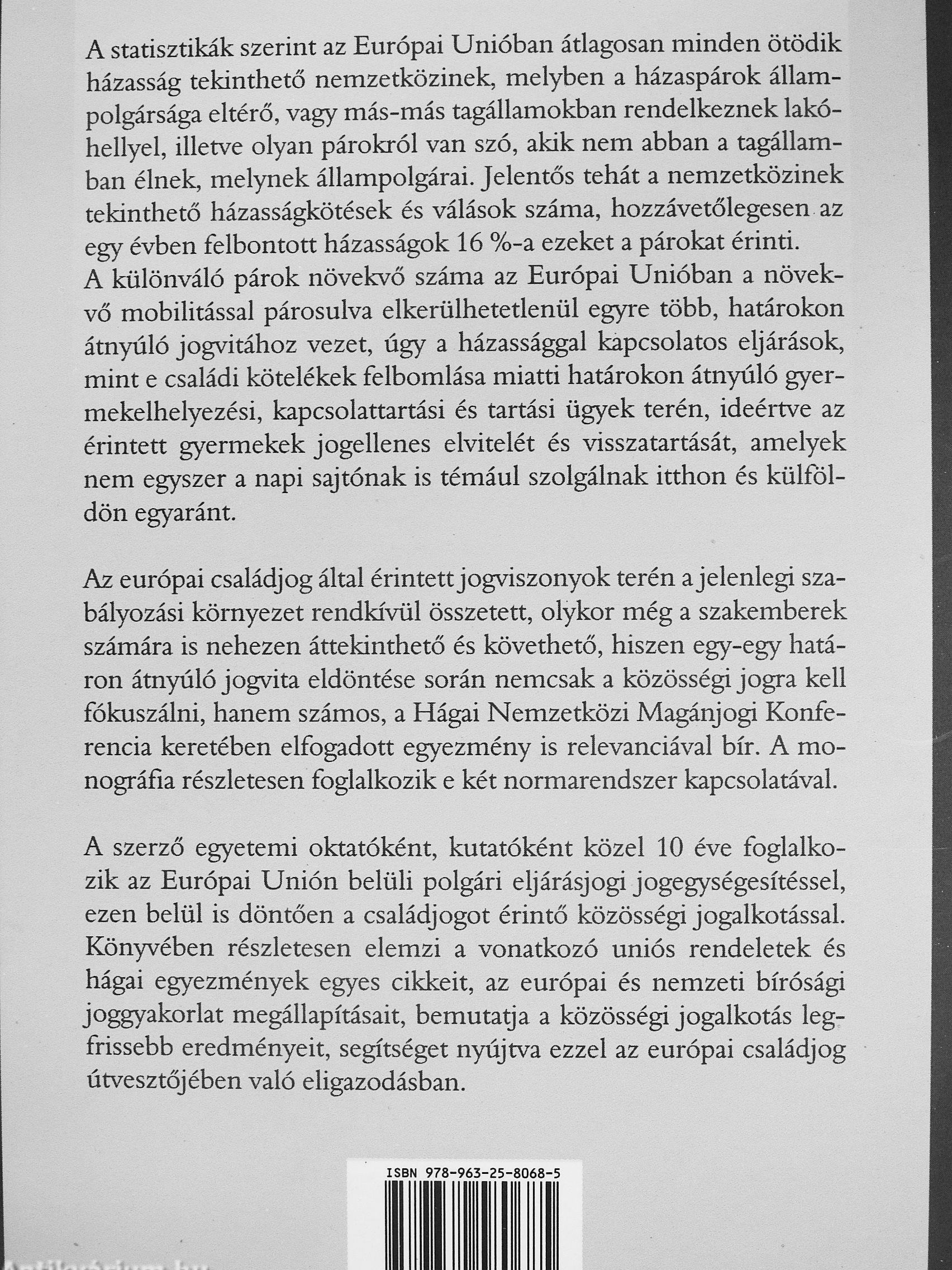 A szerző egyetemi oktatóként, kutatóként közel 10 éve foglalkozik az Európai Unión belüli polgári eljárásjogi jogegységesítéssel, ezen belül is döntően a családjogot érintő közösségi jogalkotással. Könyvében részletesen elemzi a vonatkozó uniós rendeletek és hágai egyezmények egyes cikkeit, az európai és nemzeti bírósági joggyakorlat megállapításait, bemutatja a közösségi jogalkotás legfrissebb eredményeit, segítséget nyújtva ezzel az európai családjog útvesztőjében való eligazodásban.