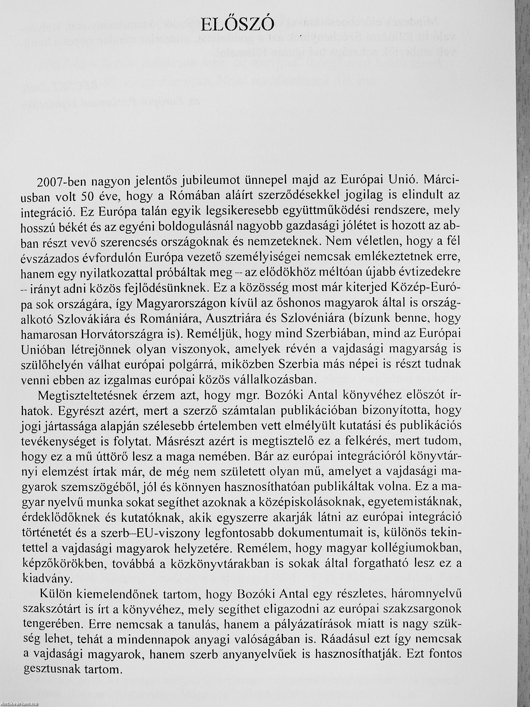 Bozóki Antalnak ez a müve impozáns eredménye annak a tevékenységnek, amellyel a vajdasági magyar szellemi életnek már néhány képviselője elképesztett bennünket. A vajdasági magyar értelmiség csak hihetetlen méretű munkával alkothat a tartomány határain túlnövő értékeket. így születtek meg egymás után azok a lexikonok, amelyeket egyetlen ember hozott létre, holott máshol egész intézmények, munkacsoportok tucatjai munkájának eredményeként készülnek. Ebben a sorozatban is kiemelkedő munka Bozóki Antal mostani kötete. Elképzelni is nehéz, hogy egyetlen ember összegyűjt több mint ezer címszót, azok mindegyikét három - magyar, angol és szerb - nyelven, mindegyikére megadja az alapvető meghatározást, mellékeli a szükséges történelmi visszapillantást, összegezi a legfrissebb fejleményeket, és összegyűjt mindent, amit velük kapcsolatban tudni kell. És ezt még tetézni tudja azzal, hogy majdnem ezer rövidítésnek adja meg a meghatározását. Az egészet a legfontosabb szövegek mellékletével is... Tovább