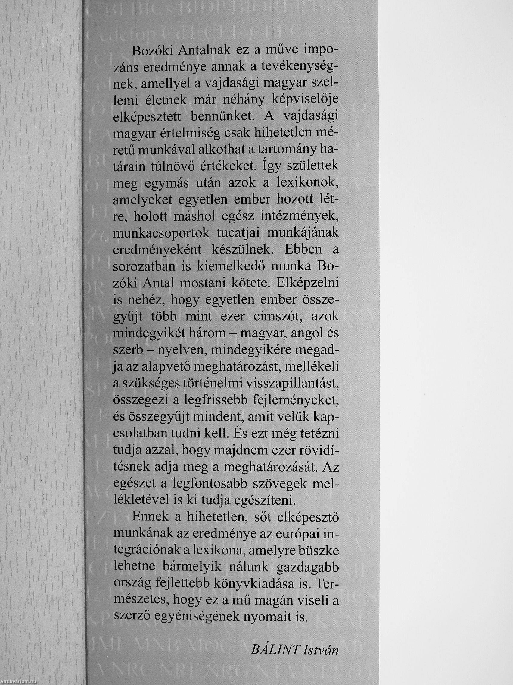 Bozóki Antalnak ez a müve impozáns eredménye annak a tevékenységnek, amellyel a vajdasági magyar szellemi életnek már néhány képviselője elképesztett bennünket. A vajdasági magyar értelmiség csak hihetetlen méretű munkával alkothat a tartomány határain túlnövő értékeket. így születtek meg egymás után azok a lexikonok, amelyeket egyetlen ember hozott létre, holott máshol egész intézmények, munkacsoportok tucatjai munkájának eredményeként készülnek. Ebben a sorozatban is kiemelkedő munka Bozóki Antal mostani kötete. Elképzelni is nehéz, hogy egyetlen ember összegyűjt több mint ezer címszót, azok mindegyikét három - magyar, angol és szerb - nyelven, mindegyikére megadja az alapvető meghatározást, mellékeli a szükséges történelmi visszapillantást, összegezi a legfrissebb fejleményeket, és összegyűjt mindent, amit velük kapcsolatban tudni kell. És ezt még tetézni tudja azzal, hogy majdnem ezer rövidítésnek adja meg a meghatározását. Az egészet a legfontosabb szövegek mellékletével is ki tudja egészíteni.